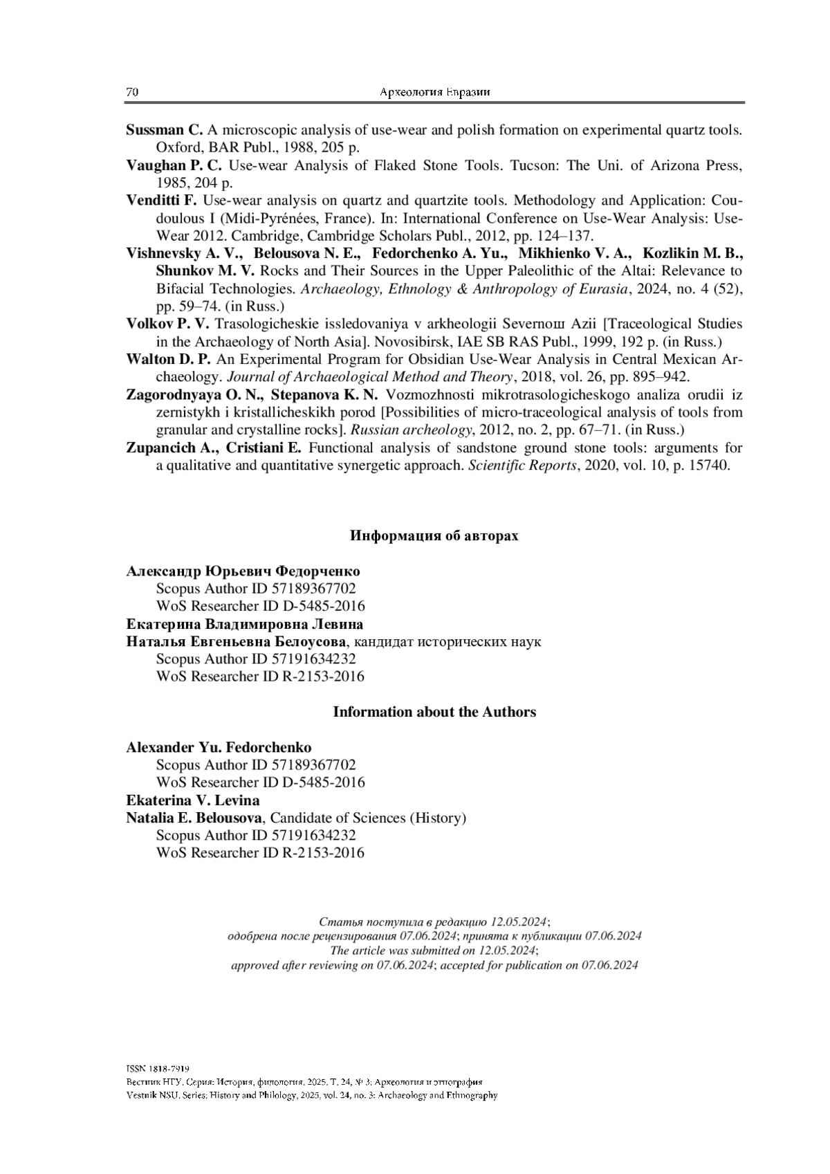14. Михиенко В. А., Плотникова П. Ю., Левина Е. В., Федорченко А. Ю., Белоусова Н. Е. Верхнепалеолитические скребки из Денисовой пещеры: результаты типологического и экспериментально-трасологического исследования // Проблемы археологии, этнографии и антропологии Сибири и сопредельных территорий. Новосибирск: Изд-во ИАЭТ СО РАН, 2024. Т. 30. С. 185-192.
