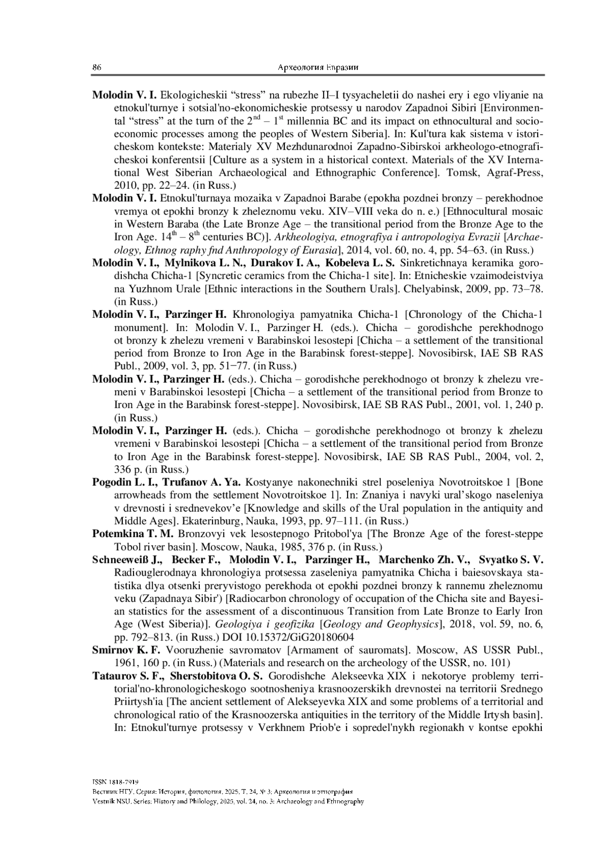 22. Молодин В. И. Этнокультурная мозаика в Западной Барабе (эпоха поздней бронзы - переходное время от эпохи бронзы к железному веку. XIV-VIII века до н. э.) // Археология, этнография и антропология Евразии. 2014. № 4 (60). С. 54-63.