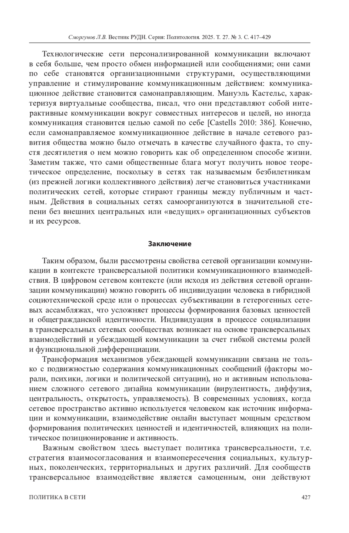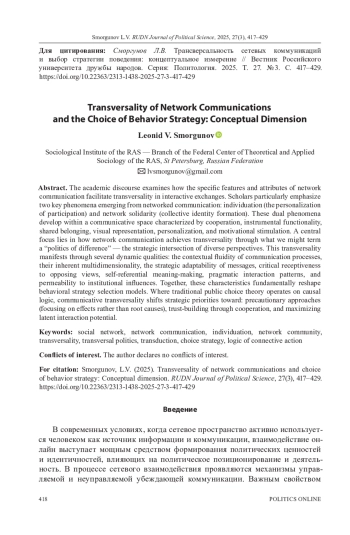 В современных условиях, когда сетевое пространство активно используется человеком как источник информации и коммуникации, взаимодействие онлайн выступает мощным средством формирования политических ценностей и идентичностей, влияющих на политическое позиционирование и деятельность. В процессе сетевого взаимодействия проявляются механизмы управляемой и неуправляемой убеждающей коммуникации. Важным свойством такого взаимодействия выступает политика трансверсальности, т. е. стратегия взаимосогласования и взаимопересечения социальных, культурных, поколенческих, территориальных и других различий.