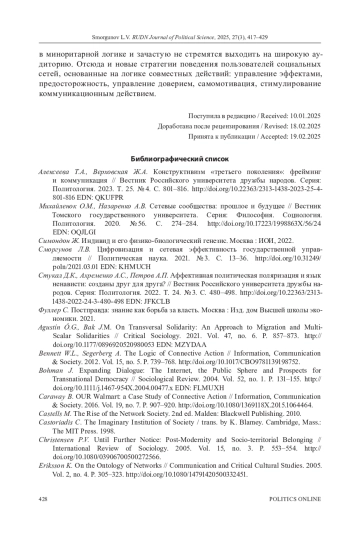 1. Алексеева Т.А., Верховская Ж.А. Конструктивизм “третьего поколения”: фрейминг и коммуникация // Вестник Российского университета дружбы народов. Серия: Политология. 2023. Т. 25. № 4. С. 801-816. DOI: 10.22363/2313-1438-2023-25-4-801-816 EDN: QKUFPR