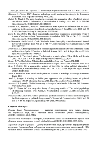 27. Wojcieszak M.E., Mutz D.C. Online groups and political discourse: do online discussion spaces facilitate exposure to political disagreement? // Journal of Communication. 2009. Vol. 59. No. 1. P. 40-56. DOI: 10.1111/j.1460-2466.2008.01403.x