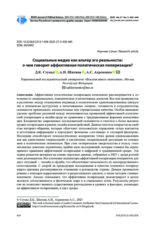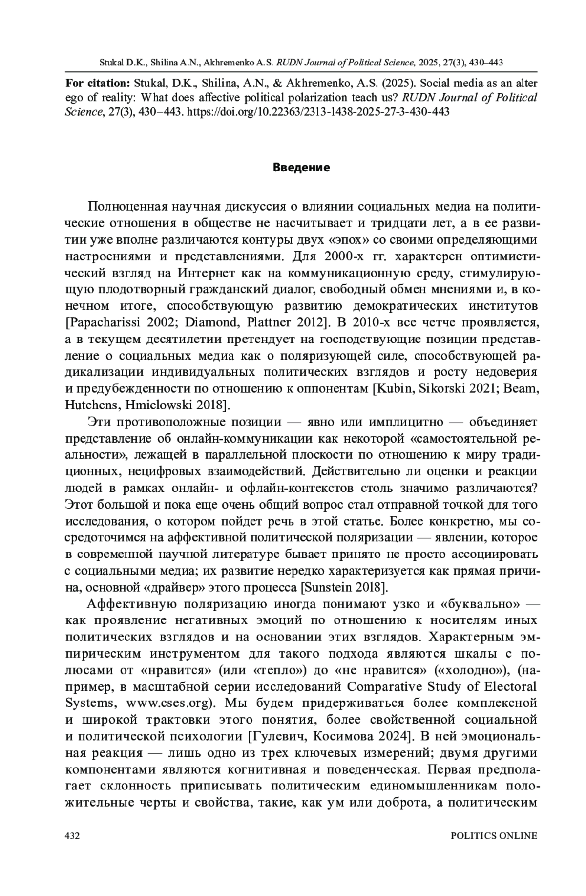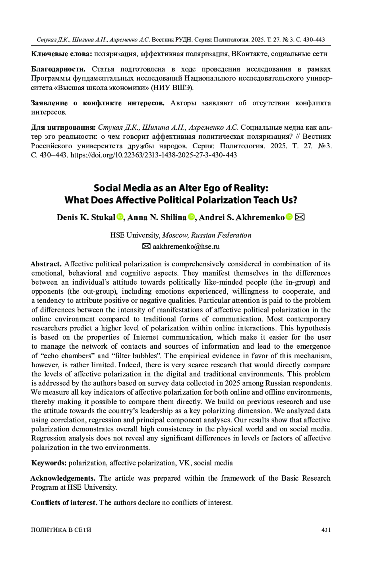 7. Стукал Д.К., Ахременко А.С., Петров А.П. Аффективная политическая поляризация и язык ненависти: созданы друг для друга? // Вестник Российского университета дружбы народов. Серия: Политология. 2022. Т. 24, № 3. С. 480-498. DOI: 10.22363/2313-1438-2022-24-3-480-498 EDN: VLTQRN