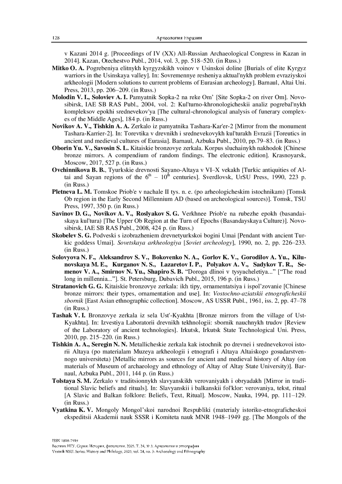 9. Бородовский А. П., Тишкин А. А. Металлическое зеркало из Барабы // Теория и практика археологических исследований. 2016. № 4 (16). С. 23-34.