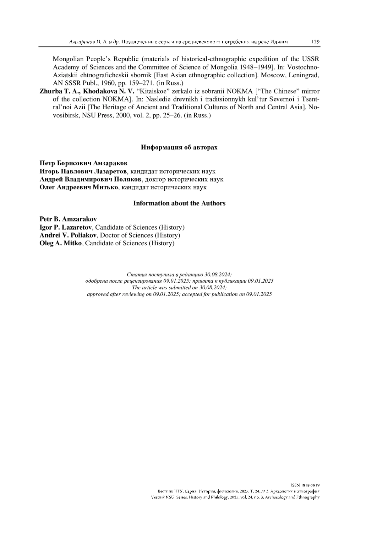 4. Амзараков П. Б., Лазаретов И. П., Митько О. А., Поляков А. В. Этнокультурная принадлежность средневекового захоронения со шкурой коня в долине реки Иджим в Западном Саяне // Вестник НГУ. Серия: История, филология. 2015а. Т. 14, № 7: Археология и этнография. С. 151-164.