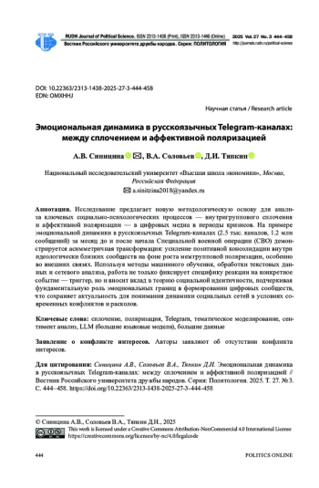 1. Ахременко А.С., Синицина А.В., Соловьев В.А. Размежевание или сплочение? Динамика сетевой структуры политических телеграм-каналов: моделирование и эмпирический анализ // Полития: Анализ. Хроника. Прогноз. 2024. № 3. С. 59-81. ;. DOI: 10.30570/2078-5089-2024-114-3-59-81 EDN: VLMIWE