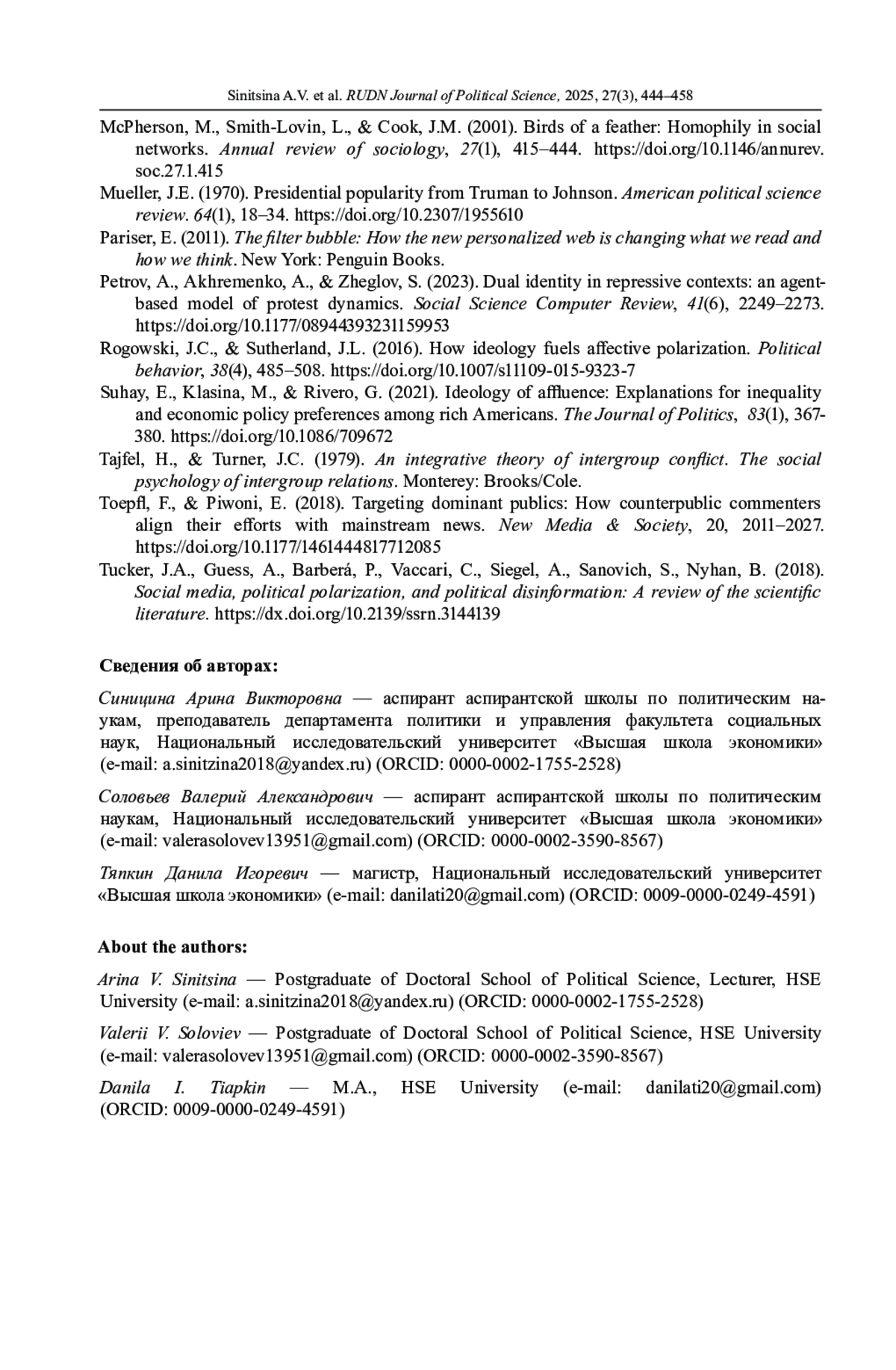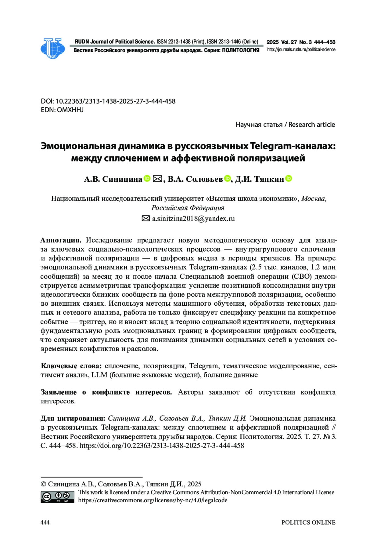 2. Синицина А.В. Измерение и моделирование эффекта сплочения в русскоязычных социальных медиа после начала СВО: анализ социальных мотиваций // Политическая наука. 2025. № 1. С. 203-218. http://www.;. DOI: 10.31249/poln/2025.01.09 EDN: CQVNAE