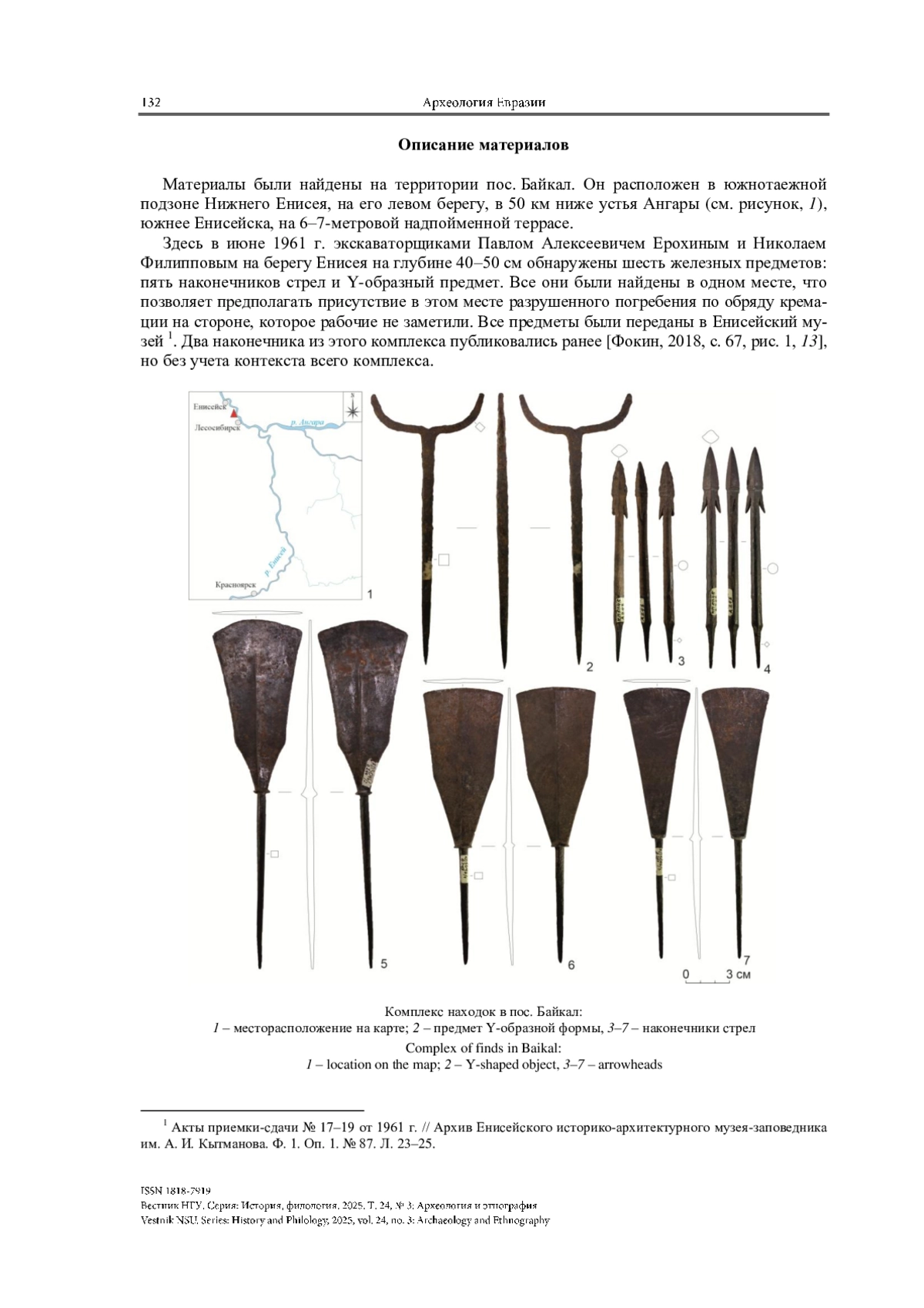 В научный оборот вводится комплекс железных предметов, найденных в окрестностях Енисейска, на территории пос. Байкал, и хранящихся в фондах Енисейского музея-заповедника им. А. И. Кытманова. В комплекс входят железное Y-образное изделие и пять разнотипных наконечников стрел. Среди последних присутствуют широкие плоские срезни монгольского времени и длинные бронебойные стрелы с шипами, характерные для таежного населения региона. На большинстве вещей наблюдаются следы окалины. Набор предметов позволяет предполагать, что здесь в ходе земляных работ было разрушено погребение по обряду трупосожжения на стороне. Комплекс относится к позднему этапу лесосибирской культуры и может быть датирован XIII–XIV вв.