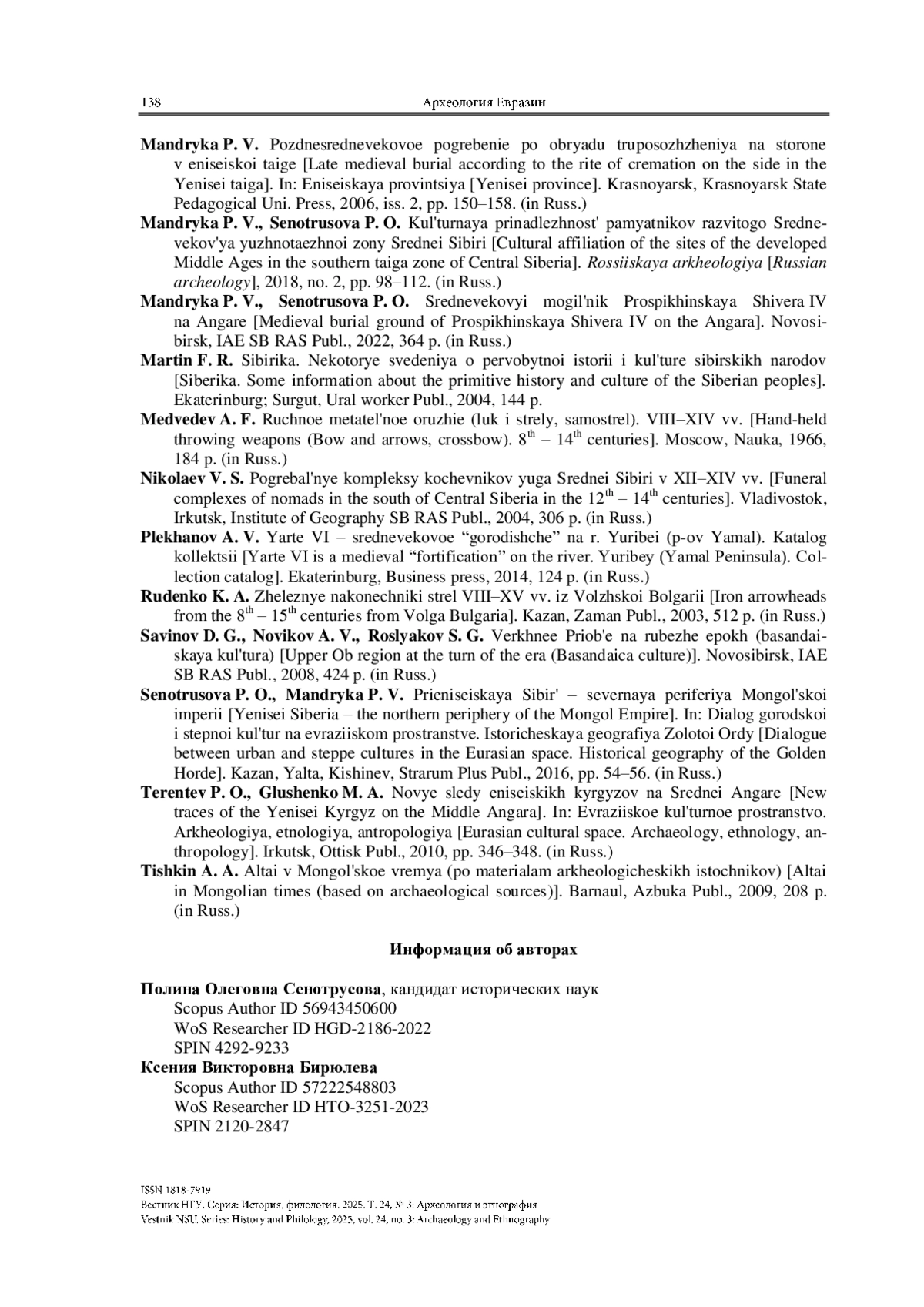 10. Мандрыка П. В., Сенотрусова П. О. Культурная принадлежность памятников развитого Средневековья южнотаежной зоны Средней Сибири // РА. 2018. № 2. С. 98-112.