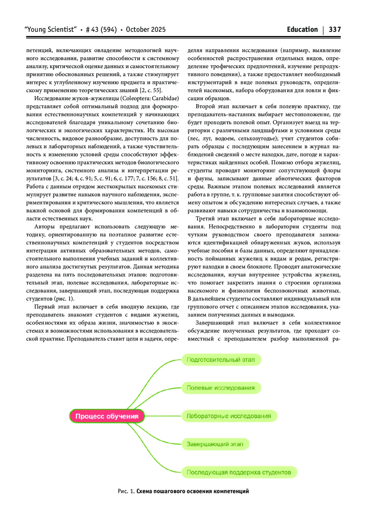 В статье авторы исследуют возможности использования процесса изучения жуков-жужелиц (Coleoptera: Carabidae) как средства формирования естественнонаучных компетенций у студентов второго курса биологического профиля. В работе рассматриваются теоретические основы компетентностного подхода в высшем образовании, обосновывается выбор жужелиц в качестве объекта исследования, описывается разработанный комплекс учебных мероприятий, направленных на развитие ключевых компетенций. На основе анализа опыта авторов формулируются рекомендации по дальнейшему совершенствованию педагогического процесса и предлагаются пути активизации самостоятельной работы студентов.