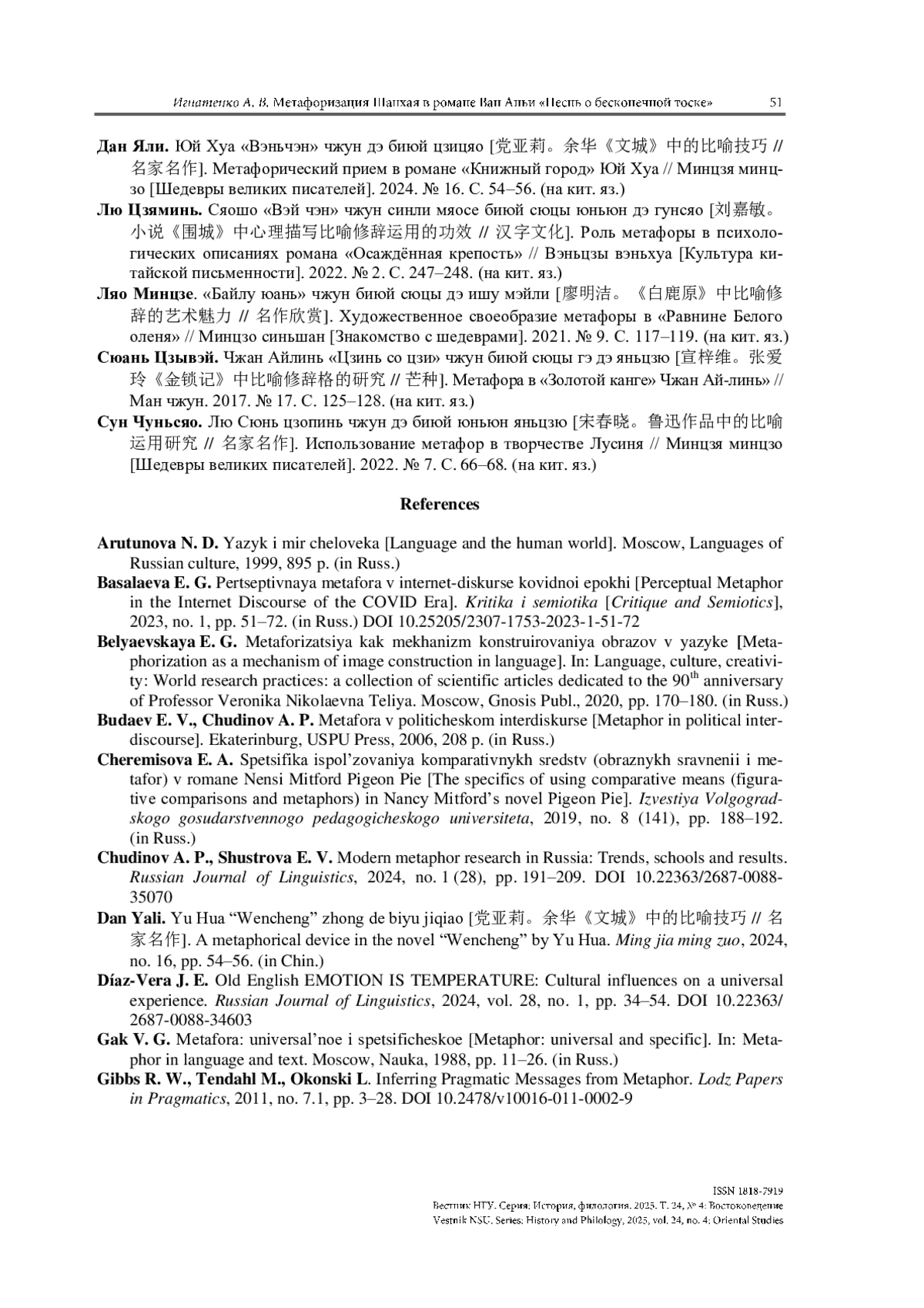 14. Chudinov A. P., Shustrova E. V. Modern metaphor research in Russia: Trends, schools and results // Russian Journal of Linguistics. 2024. Vol. 28, no. 1. P. 191-209. https://doi.org/10.22363/2687-0088-35070