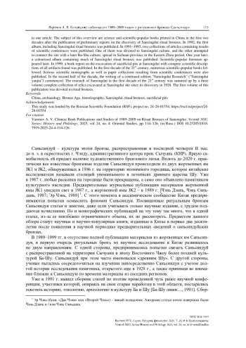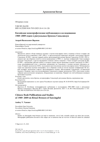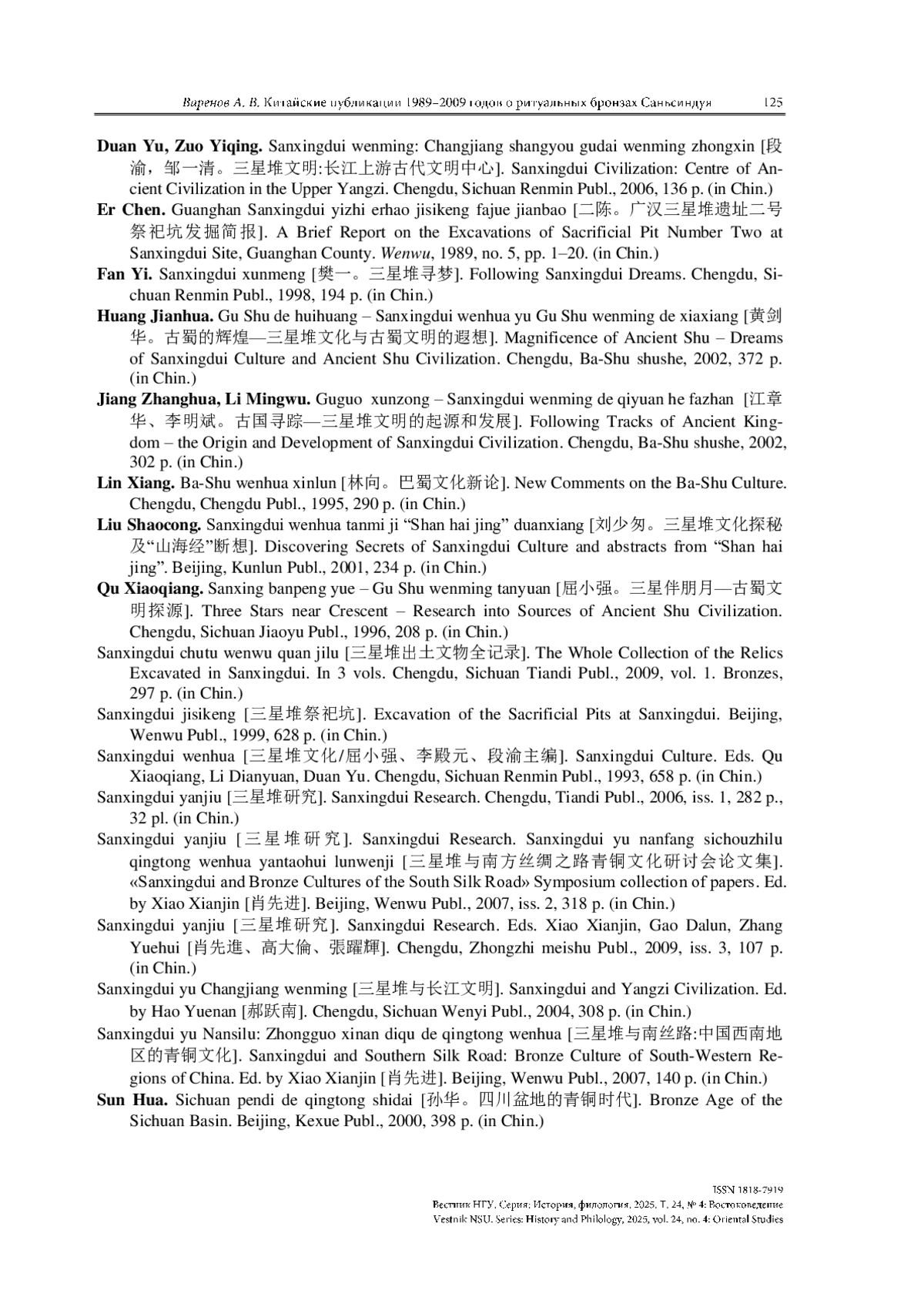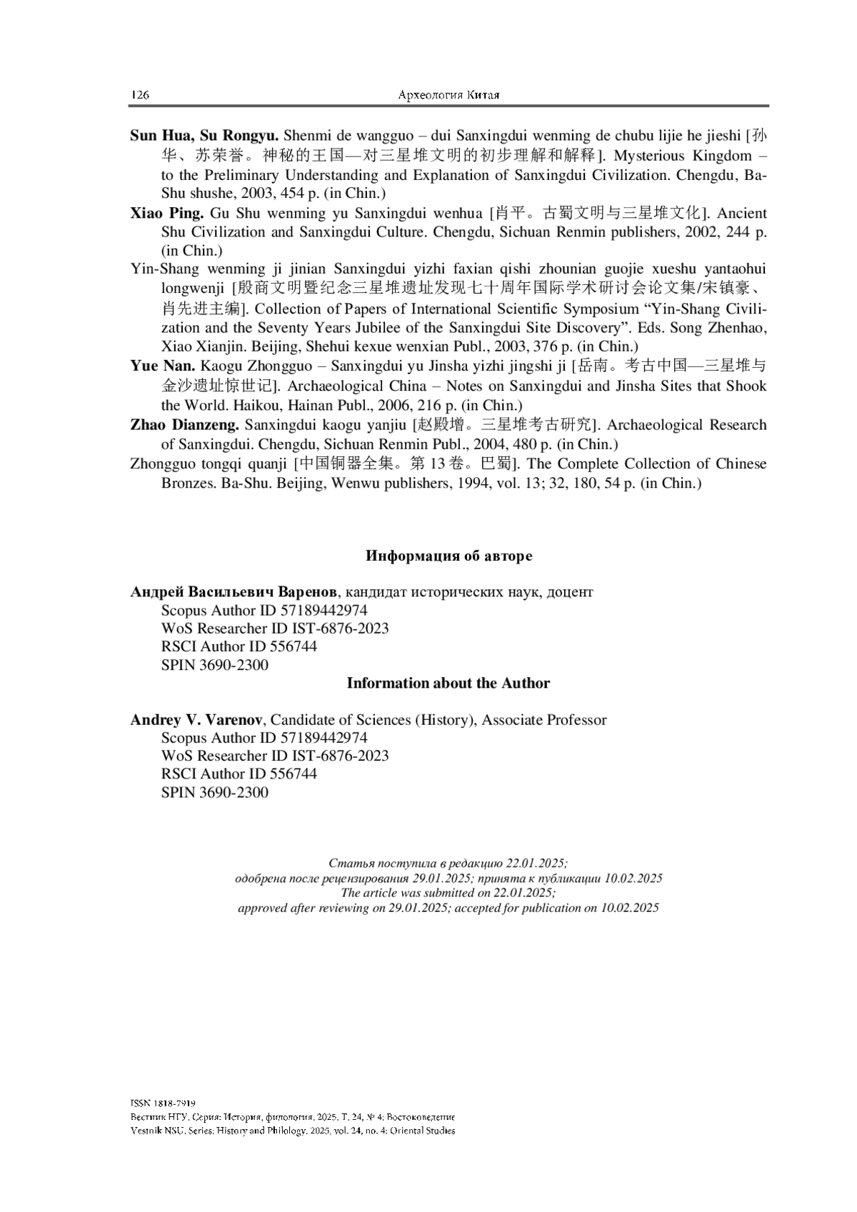ВАРЕНОВ А. В. КИТАЙСКИЕ МОНОГРАФИЧЕСКИЕ ПУБЛИКАЦИИ И ИССЛЕДОВАНИЯ 1989–2009 ГОДОВ О РИТУАЛЬНЫХ БРОНЗАХ САНЬСИНДУЯ // ВЕСТНИК НГУ. СЕРИЯ: ИСТОРИЯ, ФИЛОЛОГИЯ. 2025. ТОМ 24, № 4