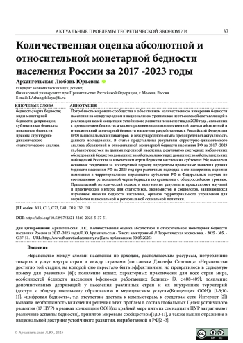 Потребность мирового сообщества в объективном количественном измерении бедности населения на международном и национальном уровнях как неотъемлемой составляющей в реализации целей концепции устойчивого развития человечества до 2030 года, связанных с преодолением бедности; а также применения для количественной оценки абсолютной и относительной монетарной бедности населения разработанных в Российской Федерации (РФ) национальных индикаторов и международного опыта предопределяет актуальность данного исследования. В статье представлены результаты структурно-динамического анализа абсолютной и относительной монетарной бедности населения РФ за 2017 -2023 гг., базирующегося на данных переписей населения, результатов ежегодных выборочных обследований бюджетов домашних хозяйств, малоимущих домашних хозяйств, панельных наблюдений Росстата за изменением черты бедности населения в субъектах РФ; выявлены основные тенденции за исследуемый период; определены прогнозные значения уровня бедности населения РФ на 2025 год при различных подходах к его измерению; оценены изменения в территориальном неравенстве субъектов РФ в Федеральных округах по соотношению региональной черты бедности по сравнению с общероссийским уровнем. Предлагаемый методический подход и полученные результаты представляют научный и практический интерес для статистиков, экономистов и социологов, занимающихся изучением явления бедности населения, органов территориального управления для выработки национальной и региональной социальной политики.