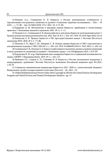 23. Разумов А.А., Селиванова О. В. Бедность в России: региональные особенности и перспективные инструменты снижения ее уровня// Социально-трудовые исследования. - 2021. - № 4(45). - c. 75-88. -. DOI: 10.34022/2658-3712-2021-45-4-75-88 EDN: SNUWCF