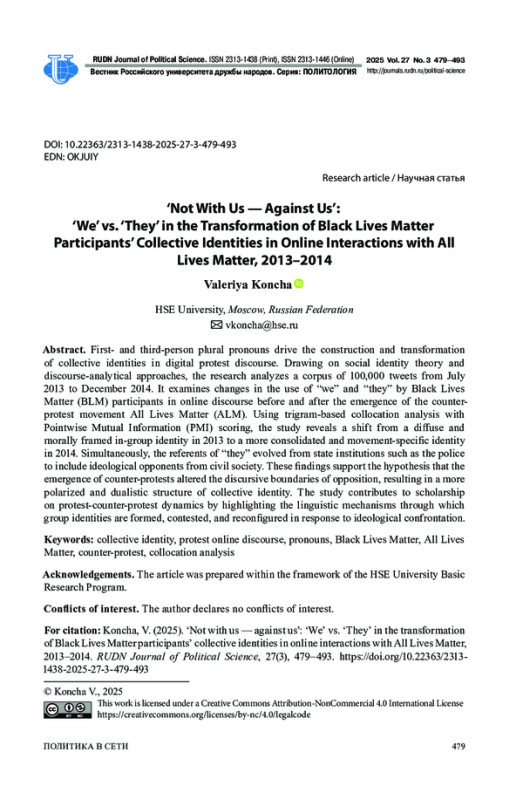 Трансформация коллективной идентичности в цифровом протестном дискурсе может фиксироваться с помощью отслеживания употребления местоимений первых и третьих лиц во множественном числе. Основываясь на теории коллективной идентичности и дискурсивном подходе, автор анализирует выборку из 100 000 твитов, опубликованных в период с июля 2013 г. по декабрь 2014 г., чтобы проследить использование местоимений «мы» и «они» до и после появления контрпротестного движения All Lives Matter. С применением триграммного коллокационного анализа и расчёта PMI (информационной взаимной значимости) выявляется переход от разрозненной и морально окрашенной внутригрупповой коллективной идентичности в 2013 г. к более устойчивой и политически оформленной идентичности в 2014 г. Одновременно изменяется и образ «других»: если в 2013 г. он был представлен преимущественно государственными институтами (например, полицией), то в 2014 г. он дополняется идеологическими оппонентами из гражданского общества. Полученные результаты подтверждают гипотезу о том, что появление контрпротестов изменило дискурсивные границы оппозиции, усилив поляризацию и дуализм в структуре коллективной идентичности. Работа вносит вклад в изучение взаимодействия протестов и контрпротестов, выявляя лингвистические механизмы формирования, оспаривания и перестройки групповой идентичности в условиях идеологического противостояния.
