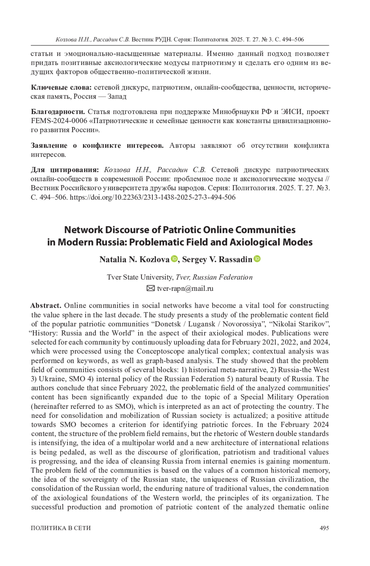 Онлайн-сообщества в социальных сетях в последнее десятилетие стали важнейшим инструментом конструирования ценностной сферы. Представлено исследование проблемного поля контента популярных патриотических сообществ в социальной сети «ВКонтакте» - «Донецк / Луганск / Новороссия», «Николай Стариков», «История: Россия и мир» в аспекте их аксиологических модусов. Для каждого сообщества были выбраны публикации путем сплошной выгрузки данных за февраль 2021, 2022, 2024 гг., которые подверглись обработке при помощи аналитического комплекса «Концептоскоп»; по ключевым словам проводился контекстный анализ, а также анализ на основе графов. Исследование показало, что проблемное поле сообществ состоит из нескольких блоков: 1) исторический метанарратив, 2) Россия - Запад, 3) Украина, СВО, 4) внутренняя политика РФ, 5) природные красоты России. Авторы приходят к выводу, что с февраля 2022 г. проблемное поле контентов анализируемых сообществ существенно расширяется за счет темы Специальной военной операции (СВО), которая трактуется как акт защиты страны; актуализируется необходимость консолидации и мобилизации российского общества; положительное отношение к СВО становится критерием идентификации патриотических сил. В контенте за февраль 2024 г. структура проблемного поля сохраняется, однако усиливается риторика двойных стандартов Запада, педалируется идея многополярного мира и новой архитектуры международных отношений, а также прогрессирует дискурс героизации, патриотизма и традиционных ценностей, набирает силу идея очищения России от внутренних врагов. Проблемное поле сообществ опирается на ценности общей исторической памяти, идеи суверенности российского государства, уникальности российской цивилизации, консолидации русского мира, непреходящего характера традиционных ценностей, осуждения аксиологических оснований западного мира и принципов его организации. Успешное производство и продвижение патриотического контента анализируемых тематических онлайн-сообществ определяется использованием комплексного подхода, сочетающего исторический нарратив и актуальный событийный ряд, аналитические статьи и эмоционально-насыщенные материалы. Именно данный подход позволяет придать позитивные аксиологические модусы патриотизму и сделать его одним из ведущих факторов общественно-политической жизни.