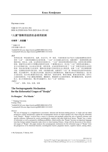 Выбор говорящим тех или иных лексических единиц обусловлен целостной оценкой ситуации, и социолингвистические факторы, которые учитывают говорящие при использовании слова «жэньцзя», не могут быть объяснены при одностороннем подходе. Существительное «жэньцзя» не только перешло в местоимение (проминализация), но и постепенно приобрело как общее, так и специфическое референтное употребление. В силу социальных, психологических и когнитивных факторов слово «жэньцзя» имеет широкий спектр возможных значений и разнообразных трансформаций, что ведет к частым ошибкам иностранцев, изучающих китайский язык. В данной статье анализируется социопрагматический механизм употребления «жэньцзя» с точки зрения его риторической функции, социолингвистических, прагматических и когнитивных факторов и указывается, что социолингвистические факторы говорящего основываются на разговорном намерении и фактическом контексте. Отмечается, что говорящий выбирает «жэньцзя» для выражения особой референциальной функции, исходя из разговорных намерений, учитывая социально-психологические факторы в реальном контексте, для достижения конкретной коммуникативной цели и определенного риторического эффекта и что выбор использования «жэньцзя» является сознательным целенаправленным языковым манипулированием. Чтобы помочь обучающимся овладеть грамматическими функциями, оценочной и стилистической окраской слова «жэньцзя», авторы предлагают опираться на уже имеющиеся у учащихся знания и разрабатывать коммуникативные задания в соответствии с их уровнем и возможностью усвоения материала. Необходимо задавать ситуативный контекст и отрабатывать употребление слова в разных коммуникативных ситуациях. На начальном этапе изучения китайского языка во избежание утраты мотивации обучающихся не рекомендуется вводить полный спектр значений и особенностей употребления и стремиться немедленно исправлять все ошибки обучающихся. Необходимо оставлять больше времени для практики. Изучать и практиковать использование «жэньцзя» в функции самореференции следует на среднем и продвинутом уровнях обучения.