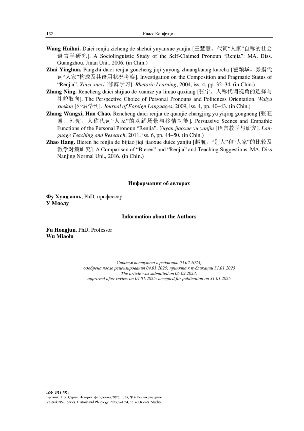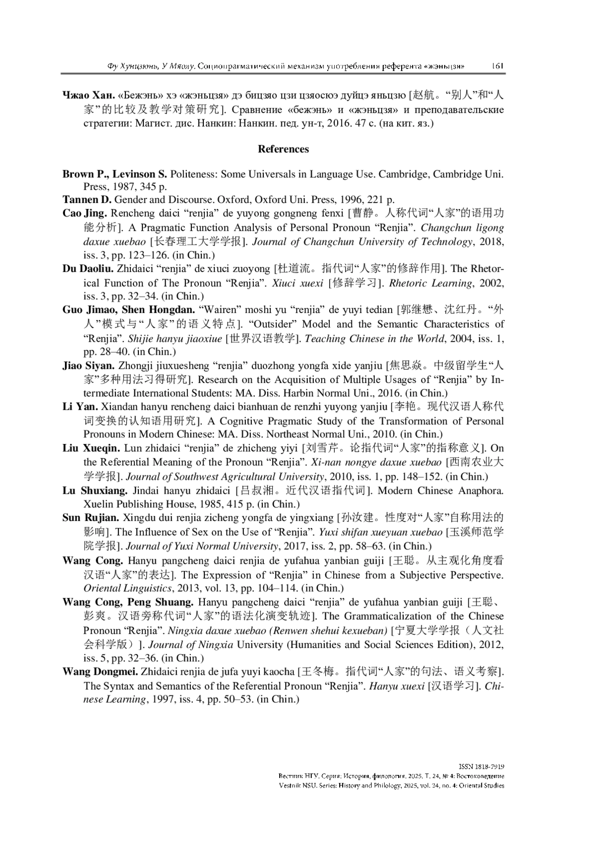 13. Цао Цзин. Жэньчэн дайцы «жэньяцзя»дэ юйюн гуннэн фэньси [曹静。人称代词“人家”的语 用功能分析]. Анализ прагматической функции личного местоимения «жэньцзя» // Чанчунь лигун дасюэ сюэбао [长春理工大学学报]. 2018. Вып. 3. С. 123-126. (на кит. яз.)