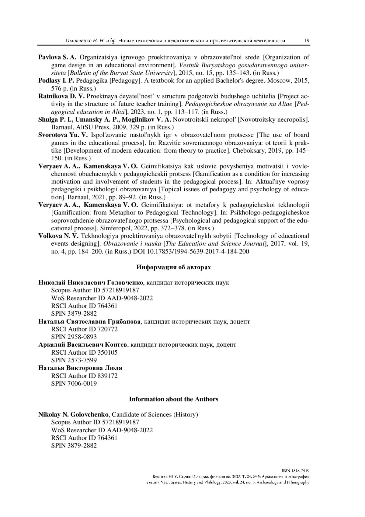 6. Головченко Н. Н., Грибанова Н. С., Вайцель Д. Э. Опыт разработки археологического мультимедийного контента для студентов педагогических университетов // Вестник НГУ. Серия: История, филология. 2023. Т. 22, № 5: Археология и этнография. С. 9-19. https://doi.org/10.25205/1818-7919-2023-22-5-9-19