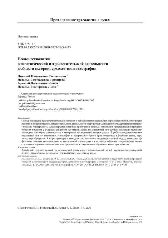 Статья посвящена рассмотрению опыта создания и использования настольных игр по археологии, этнографии, истории в педагогической, просветительской деятельности сотрудников Алтайского государственного педагогического университета. Анализируется практика применения игровых технологий при реализации просветительских проектов с участием студентов-историков. Базой для разработки игр служат коллекции Историко-краеведческого музея университета и материалы исследований авторов статьи. В работе представлены пять настольных игр по археологии, этнографии и истории Алтайского края, созданных в форматах пазла, игры мемо, игры-бродилки. Авторы приходят к выводу о том, что проектно-деятельностный подход позволяет эффективно сочетать подчерпнутые из специальной литературы и в процессе обучения теоретические знания студентов с игровыми механизмами их презентации в современном образовательном пространстве.