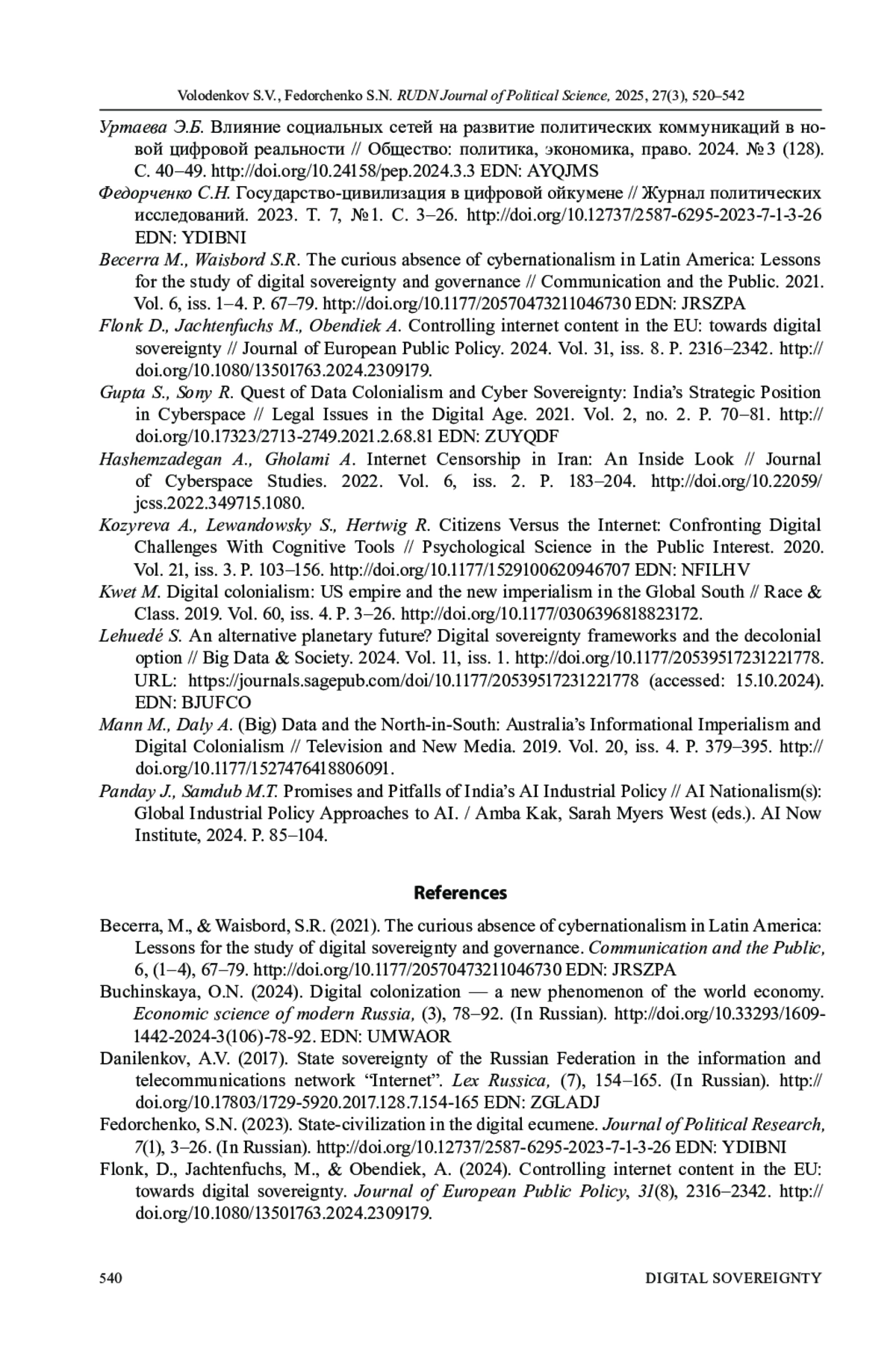 17. Lehuedé S. An alternative planetary future? Digital sovereignty frameworks and the decolonial option // Big Data & Society. 2024. Vol. 11, iss. 1. URL: https://journals.sagepub.com/doi/ (accessed: 15.10.2024). DOI: 10.1177/20539517231221778 EDN: BJUFCO