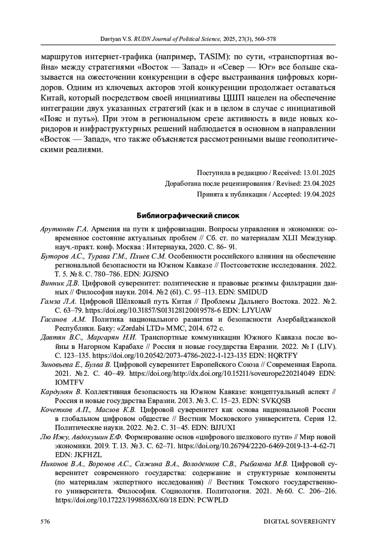 6. Давтян В.С., Маргарян Н.И. Транспортные коммуникации Южного Кавказа после войны в Нагорном Карабахе // Россия и новые государства Евразии. 2022. № I (LIV). С. 123-135. DOI: 10.20542/2073-4786-2022-1-123-135 EDN: HQRTFY