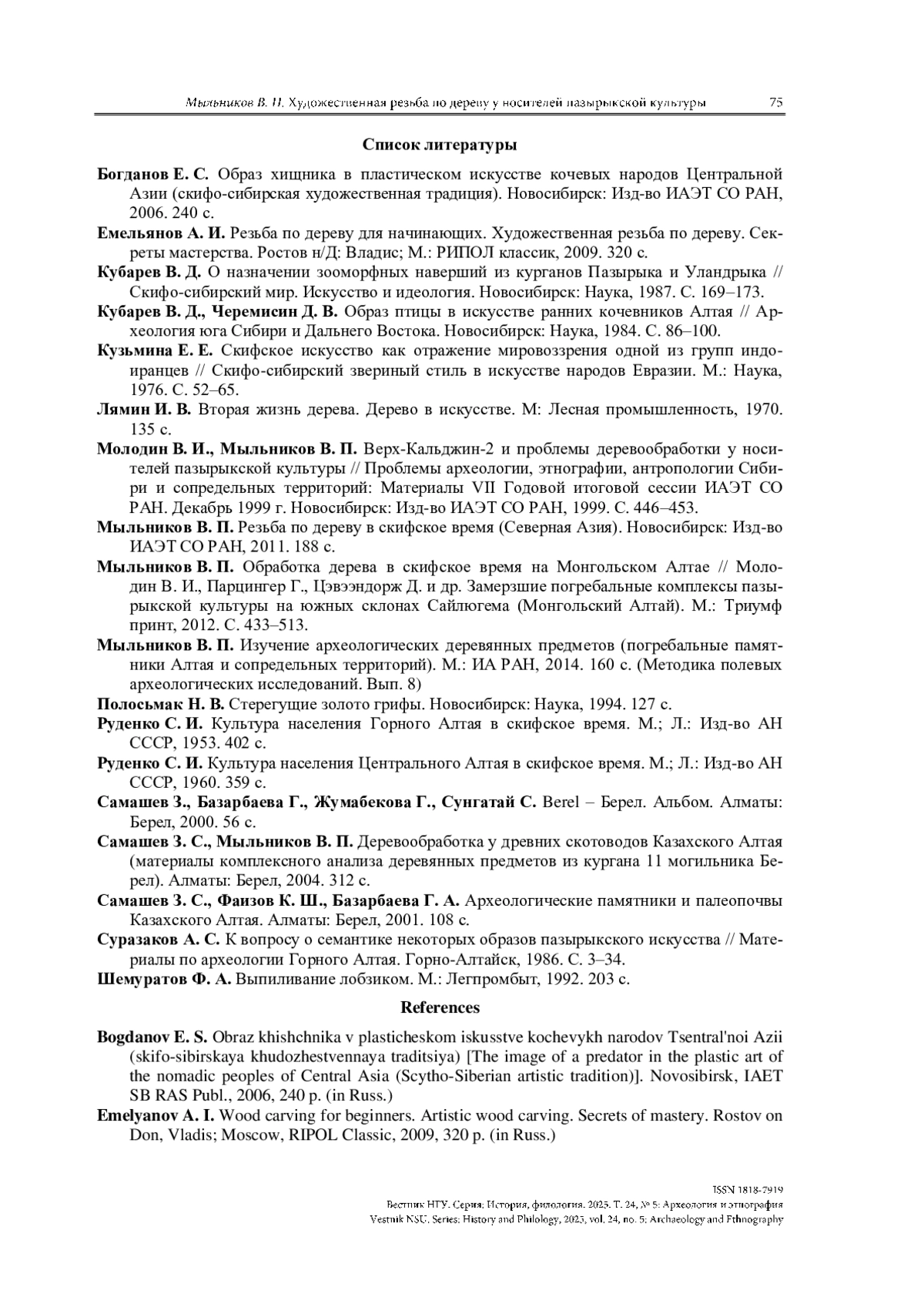 8. Мыльников В. П. Резьба по дереву в скифское время (Северная Азия). Новосибирск: Изд-во ИАЭТ СО РАН, 2011. 188 с.