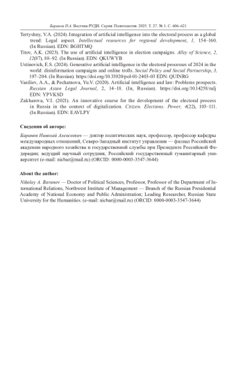 11. Тертышный В.А. Интеграция искусственного интеллекта в избирательный процесс как глобальный тренд: правовой аспект // Интеллектуальные ресурсы - региональному развитию. 2024. № 1. С. 154-160. EDN: BGHTMQ