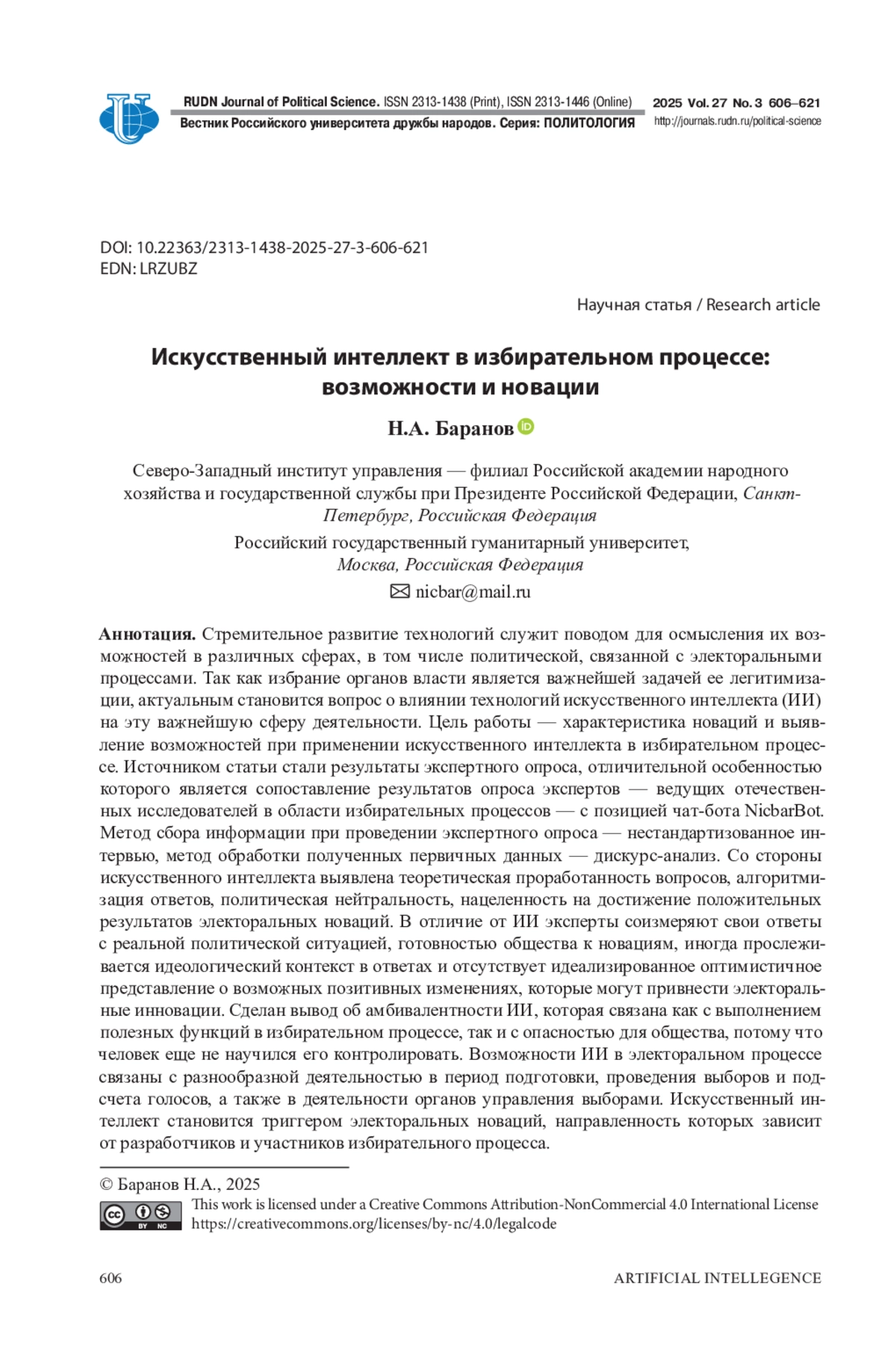 Стремительное развитие технологий служит поводом для осмысления их возможностей в различных сферах, в том числе политической, связанной с электоральными процессами. Так как избрание органов власти является важнейшей задачей ее легитимизации, актуальным становится вопрос о влиянии технологий искусственного интеллекта (ИИ) на эту важнейшую сферу деятельности. Цель работы - характеристика новаций и выявление возможностей при применении искусственного интеллекта в избирательном процессе. Источником статьи стали результаты экспертного опроса, отличительной особенностью которого является сопоставление результатов опроса экспертов - ведущих отечественных исследователей в области избирательных процессов - с позицией чат-бота NicbarBot. Метод сбора информации при проведении экспертного опроса - нестандартизованное интервью, метод обработки полученных первичных данных - дискурс-анализ. Со стороны искусственного интеллекта выявлена теоретическая проработанность вопросов, алгоритмизация ответов, политическая нейтральность, нацеленность на достижение положительных результатов электоральных новаций. В отличие от ИИ эксперты соизмеряют свои ответы с реальной политической ситуацией, готовностью общества к новациям, иногда прослеживается идеологический контекст в ответах и отсутствует идеализированное оптимистичное представление о возможных позитивных изменениях, которые могут привнести электоральные инновации. Сделан вывод об амбивалентности ИИ, которая связана как с выполнением полезных функций в избирательном процессе, так и с опасностью для общества, потому что человек еще не научился его контролировать. Возможности ИИ в электоральном процессе связаны с разнообразной деятельностью в период подготовки, проведения выборов и подсчета голосов, а также в деятельности органов управления выборами. Искусственный интеллект становится триггером электоральных новаций, направленность которых зависит от разработчиков и участников избирательного процесса.