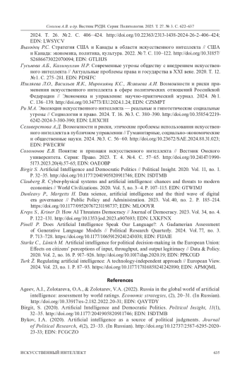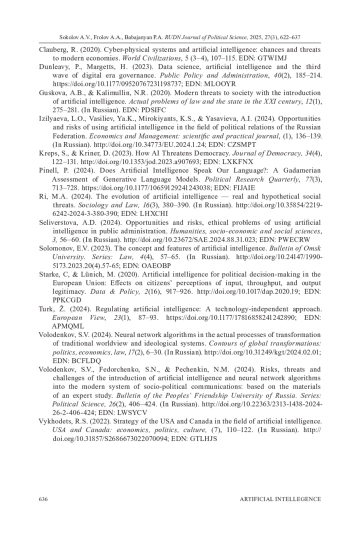 7. Изиляева Л.О., Васильев Я.К., Мирокиянц К.С., Ясавиева А.И. Возможности и риски применения искусственного интеллекта в сфере политических отношений Российской Федерации // Экономика и управление: научно-практический журнал. 2024. № 1. С. 136-139. ;. DOI: 10.34773/EU.2024.1.24 EDN: CZSMPT