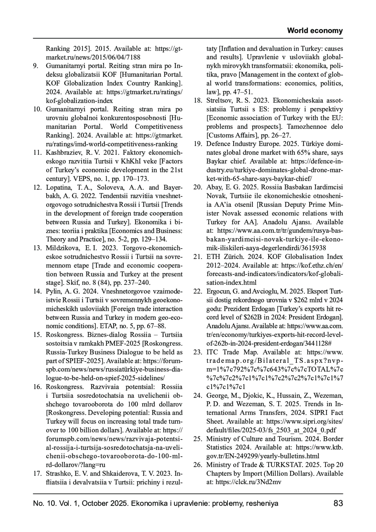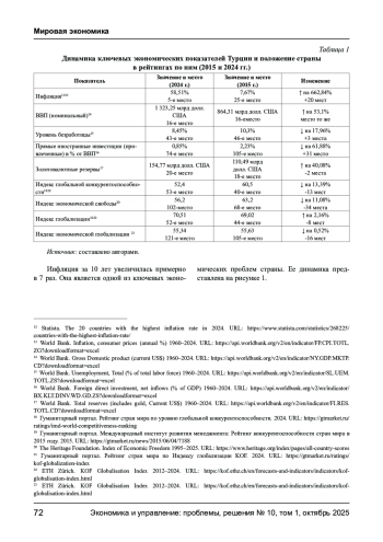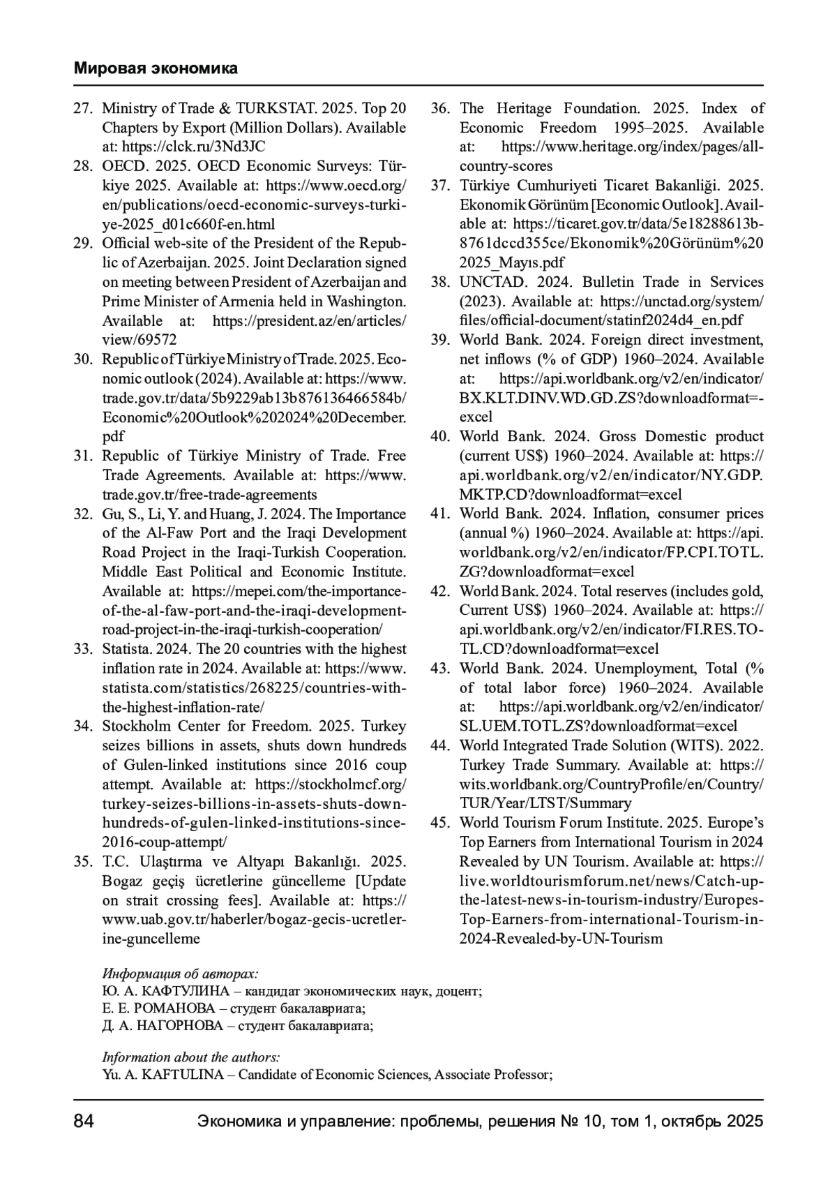КАФТУЛИНА Ю. А., РОМАНОВА Е. Е., НАГОРНОВА Д. А. ЭКОНОМИЧЕСКАЯ ДИНАМИКА И МЕЖДУНАРОДНОЕ СОТРУДНИЧЕСТВО ТУРЦИИ // ЭКОНОМИКА И УПРАВЛЕНИЕ: ПРОБЛЕМЫ, РЕШЕНИЯ. 2025. ТОМ 1 № 10