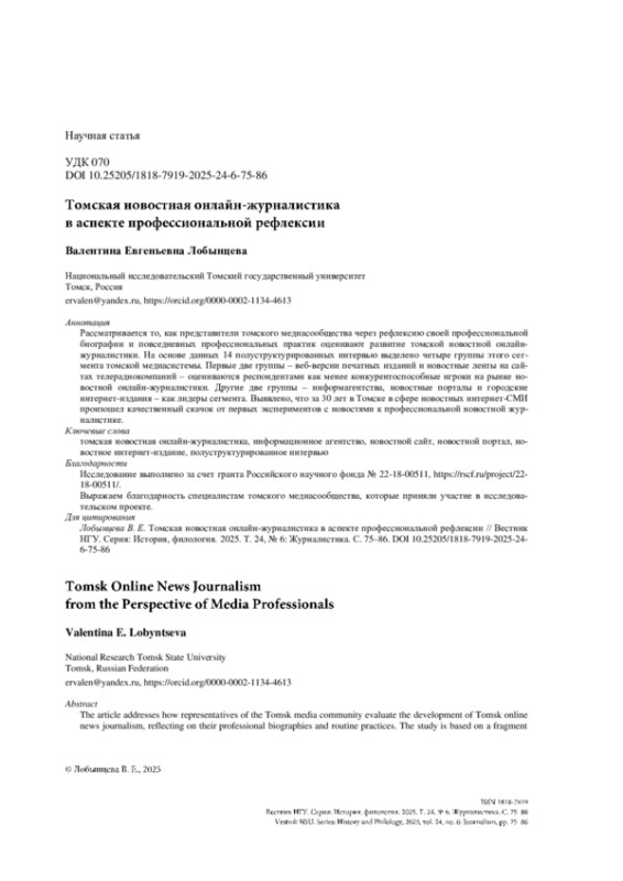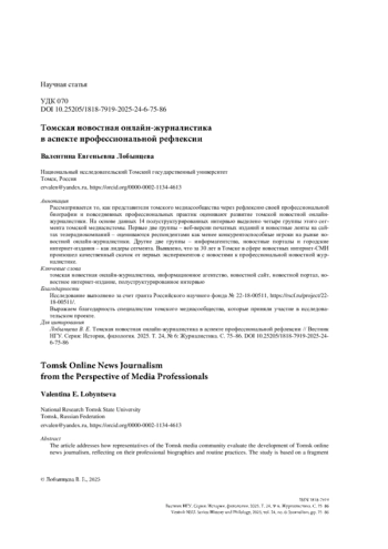 Рассматривается то, как представители томского медиасообщества через рефлексию своей профессиональной биографии и повседневных профессиональных практик оценивают развитие томской новостной онлайн-журналистики. На основе данных 14 полуструктурированных интервью выделено четыре группы этого сегмента томской медиасистемы. Первые две группы – веб-версии печатных изданий и новостные ленты на сайтах телерадиокомпаний – оцениваются респондентами как менее конкурентоспособные игроки на рынке новостной онлайн-журналистики. Другие две группы – информагентства, новостные порталы и городские интернет-издания – как лидеры сегмента. Выявлено, что за 30 лет в Томске в сфере новостных интернет-СМИ произошел качественный скачок от первых экспериментов с новостями к профессиональной новостной журналистике.