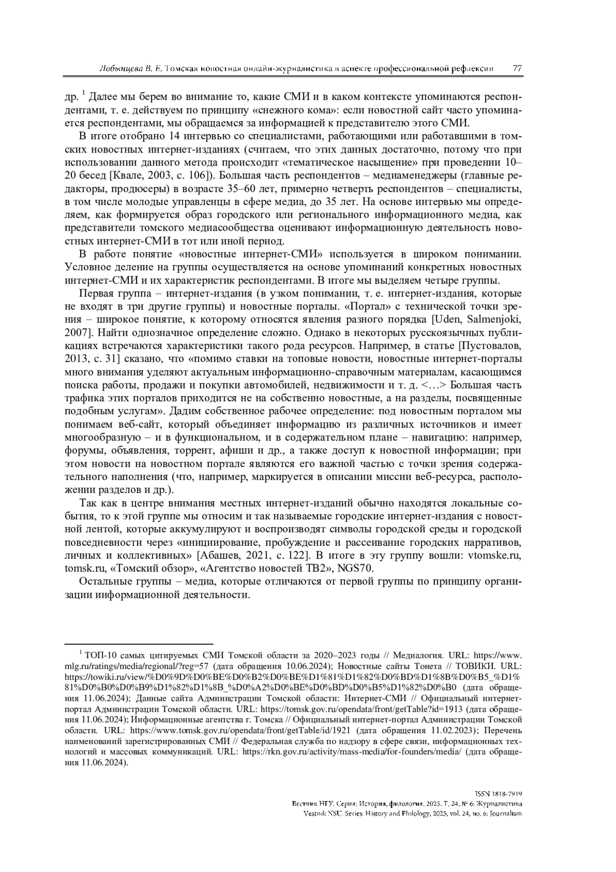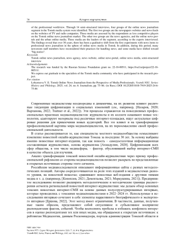 6. Ершова В. Е. Качественное интервью в исследовании томской медиасистемы // Вопросы журналистики. 2022. № 12. С. 46-62. https://doi.org/10.17223/26188422/12/2