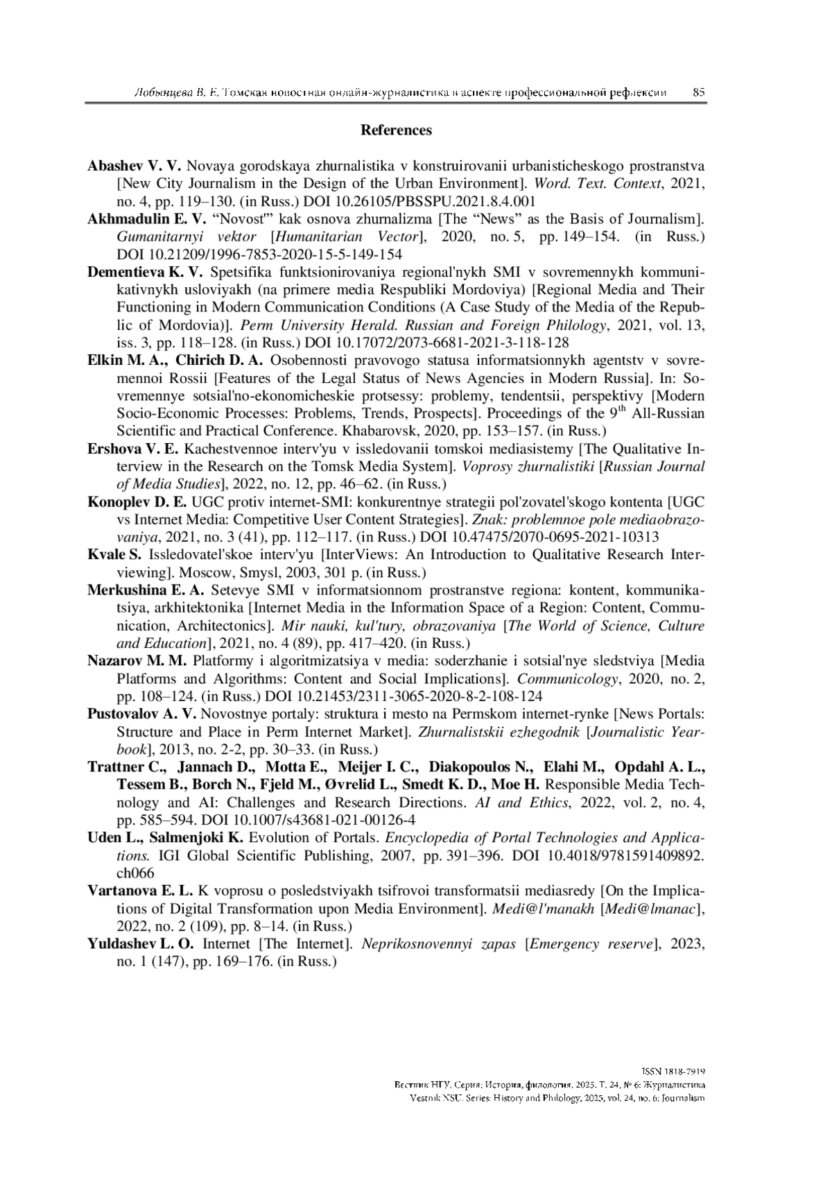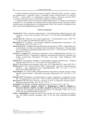 1. Абашев В. В. Новая городская журналистика в конструировании урбанистического пространства // Слово. Текст. Контекст. 2021. № 4. С. 119-130. https://doi.org/10.26105/PBSSPU.2021.8.4.001