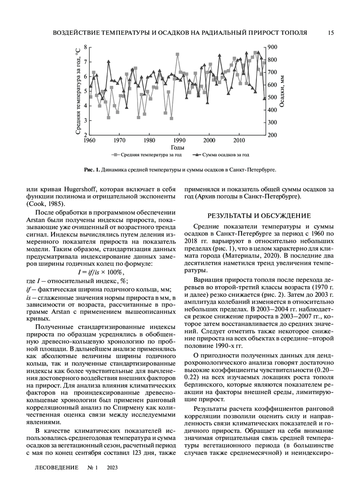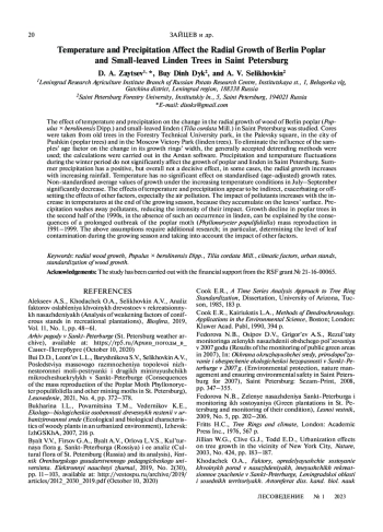 Исследовалось влияние температуры и осадков на изменение радиального прироста древесины тополя берлинского (Populus × berolinensis Dipp.) и липы мелколистной (Tilia cordata Mill.) в Санкт-Петербурге. Керны отобраны со старых деревьев в парке Лесотехнического университета, в Палевском сквере, в г. Пушкине (тополь) и в Московском парке Победы (липа). Для исключения влияния фактора возраста образца на изменение ширины его годичных колец были использованы общепринятые методы детрендинга, расчеты проводились в программном обеспечении Arstan. Колебания осадков и температуры зимнего периода значимо не влияют на рост тополя и липы в Санкт-Петербурге. Летние осадки оказывают положительное, но не определяющее воздействие, в некоторых случаях радиальный прирост древесины увеличивается с ростом количества осадков. Температура не оказывает значимого воздействия на стандартизированные (очищенные от влияния возраста) показатели прироста. Нестандартизированные средние значения прироста при увеличении температуры в июле–сентябре достоверно снижаются. Воздействие температуры и осадков, по-видимому, проявляется опосредованно, усугубляя или сглаживая воздействие других факторов, в особенности фактора загрязнения воздуха. Воздействие загрязняющих веществ усиливается при повышении температуры в конце вегетационного сезона, т. к. происходит их накопление на поверхности листьев. Осадки смывают загрязняющие вещества, снижая интенсивность влияния загрязнения. Снижение прироста во второй половине 1990-х гг. у тополя при отсутствии такового у липы объясняется последствиями продолжительной вспышки массового размножения тополёвой моли – пестрянки (Phyllonorycter populifoliella) в 1991–1999 гг. Высказанные предположения требуют дополнительных исследований, в частности определения уровня загрязнения листьев в течение вегетационного сезона и учета воздействия других факторов