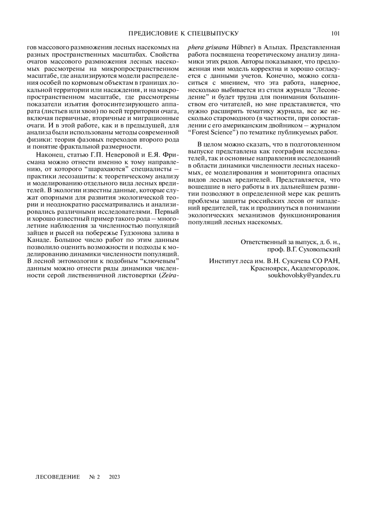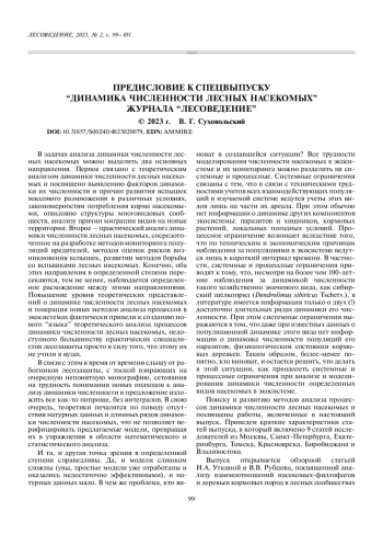 СУХОВОЛЬСКИЙ В. Г. ПРЕДИСЛОВИЕ К СПЕЦВЫПУСКУ “ДИНАМИКА ЧИСЛЕННОСТИ ЛЕСНЫХ НАСЕКОМЫХ” ЖУРНАЛА “ЛЕСОВЕДЕНИЕ” // ЛЕСОВЕДЕНИЕ. 2023. № 2