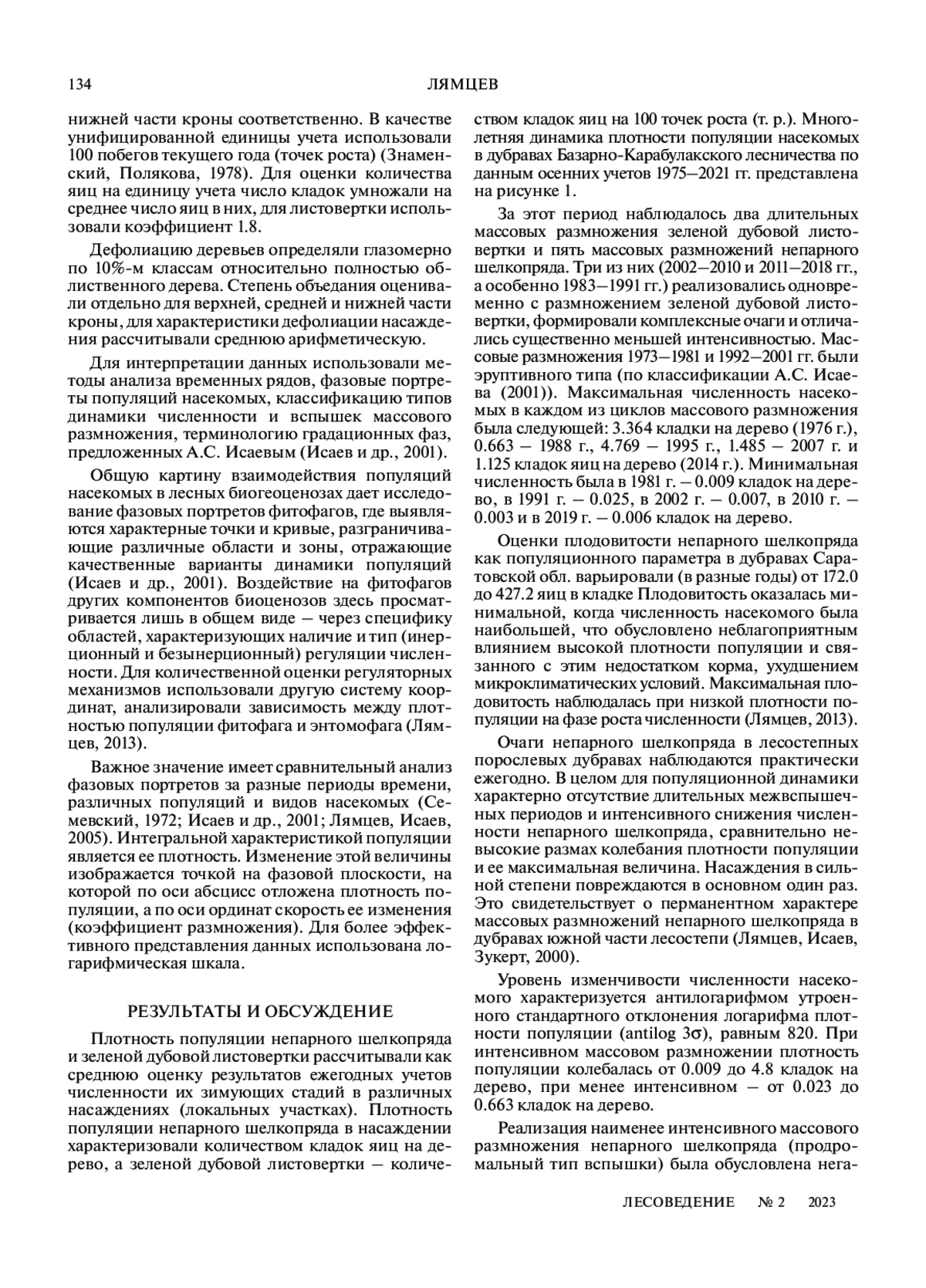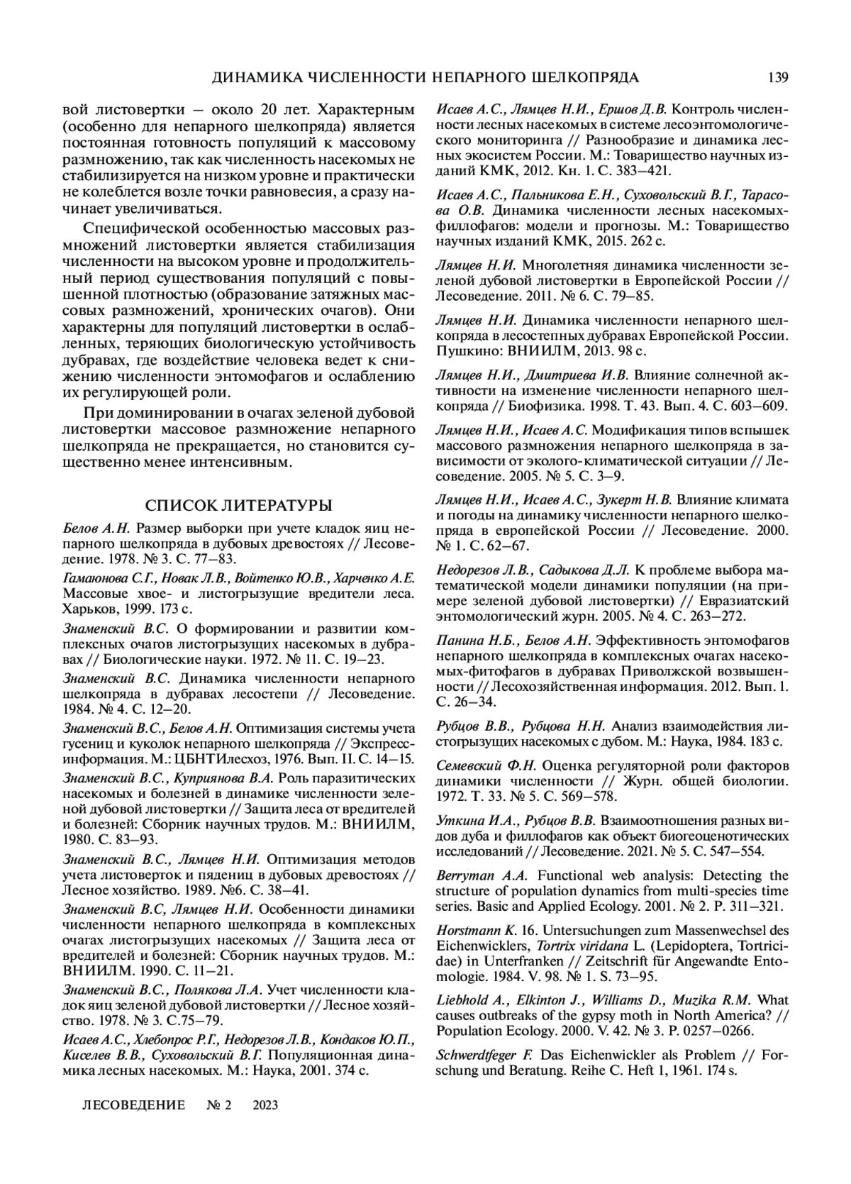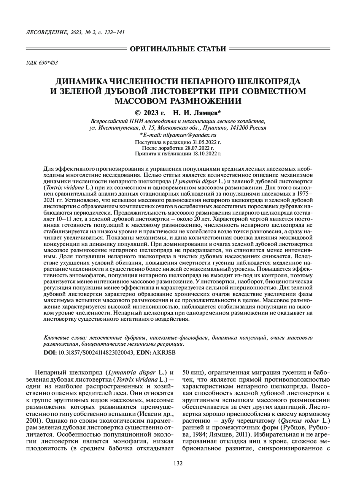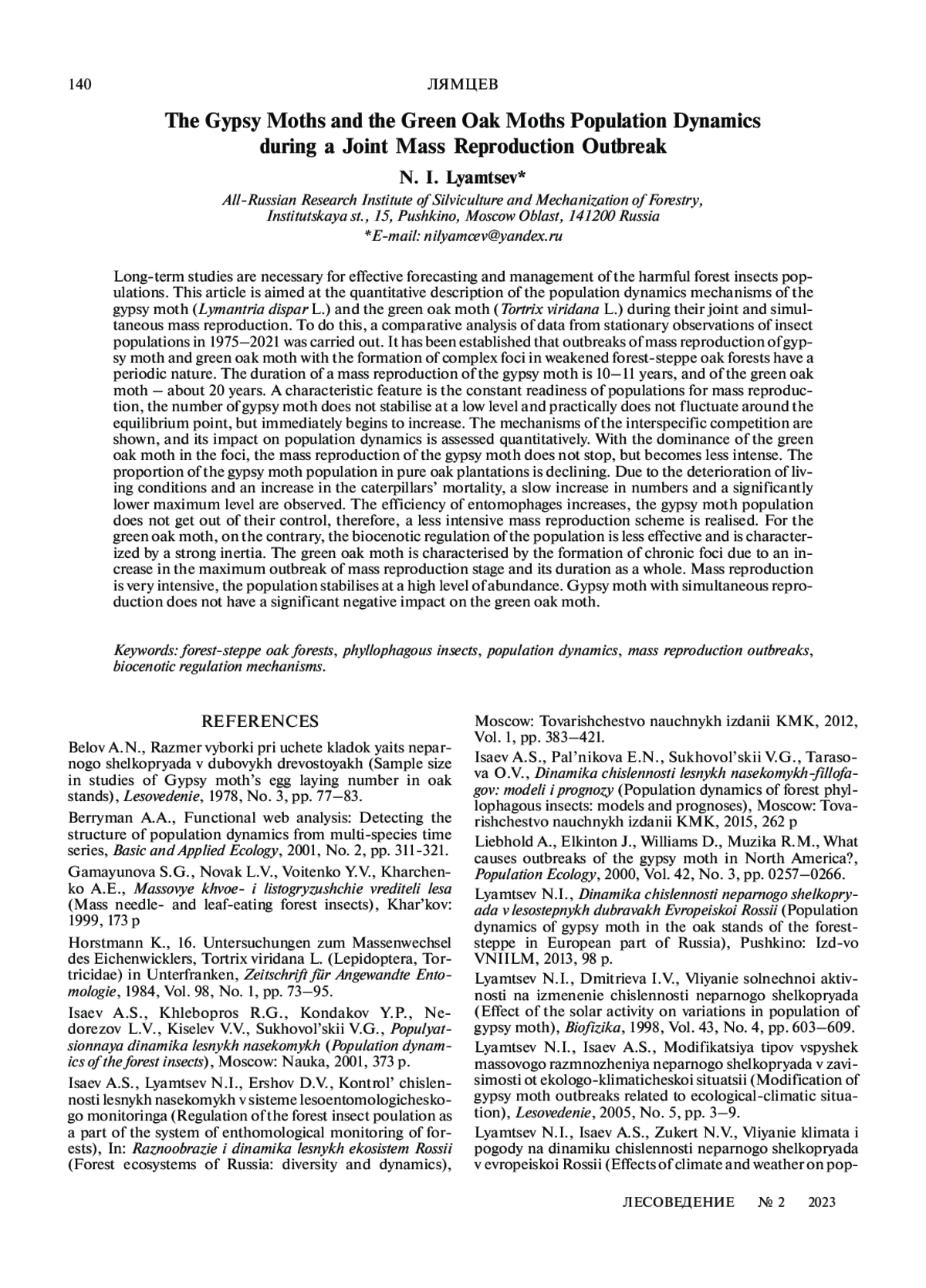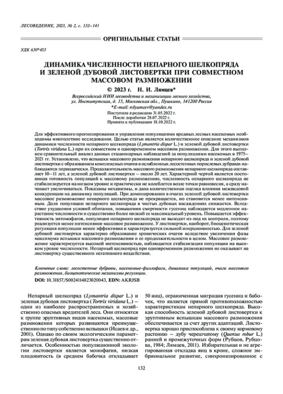 ЛЯМЦЕВ Н. И. ДИНАМИКА ЧИСЛЕННОСТИ НЕПАРНОГО ШЕЛКОПРЯДА И ЗЕЛЕНОЙ ДУБОВОЙ ЛИСТОВЕРТКИ ПРИ СОВМЕСТНОМ МАССОВОМ РАЗМНОЖЕНИИ // ЛЕСОВЕДЕНИЕ. 2023. № 2