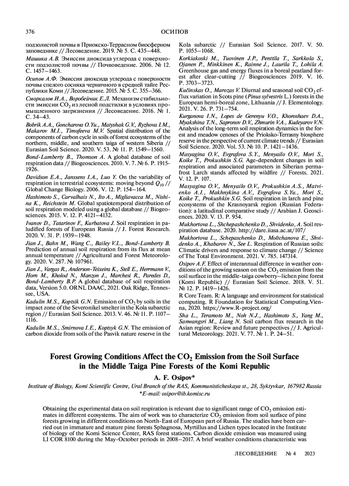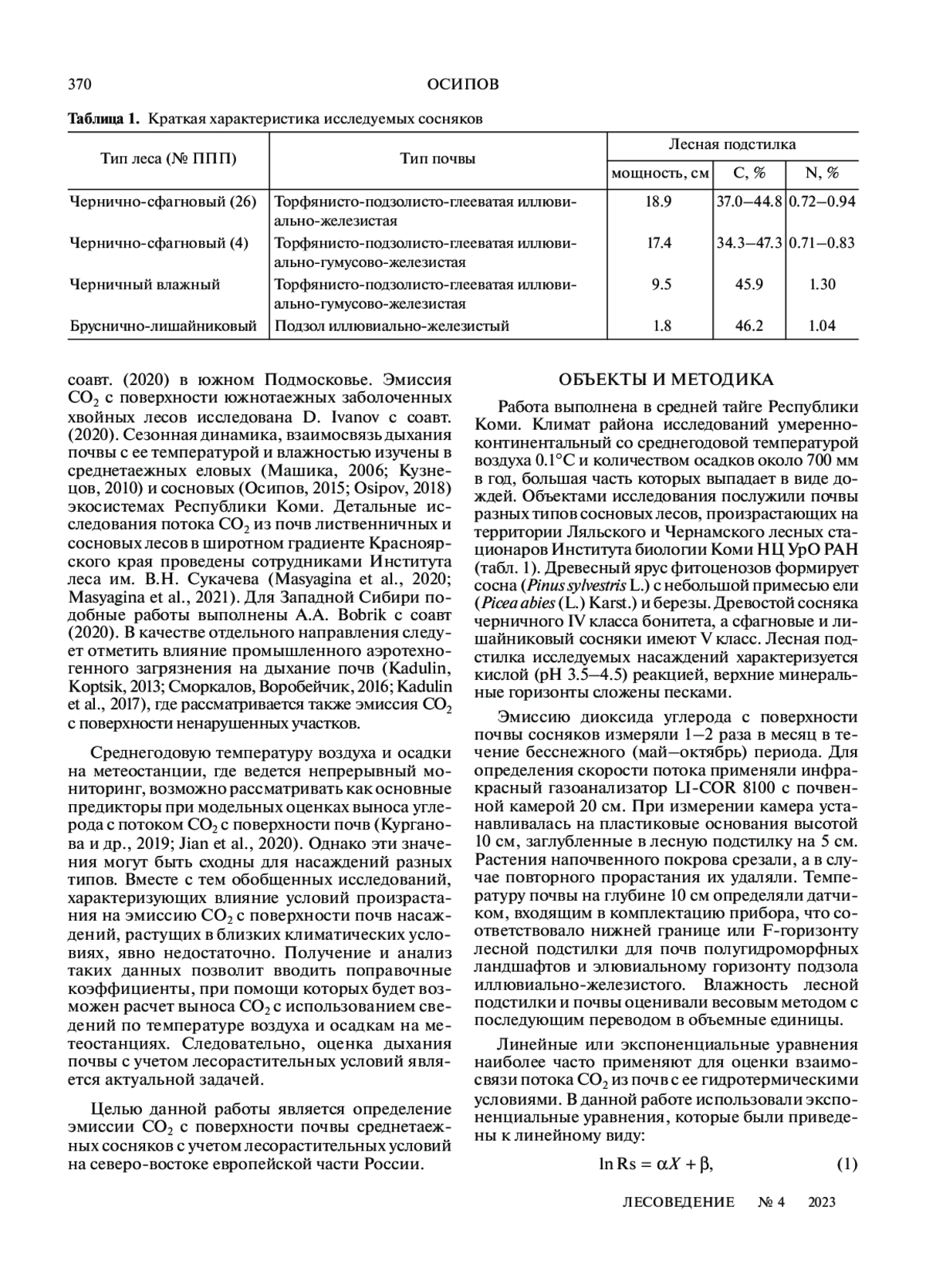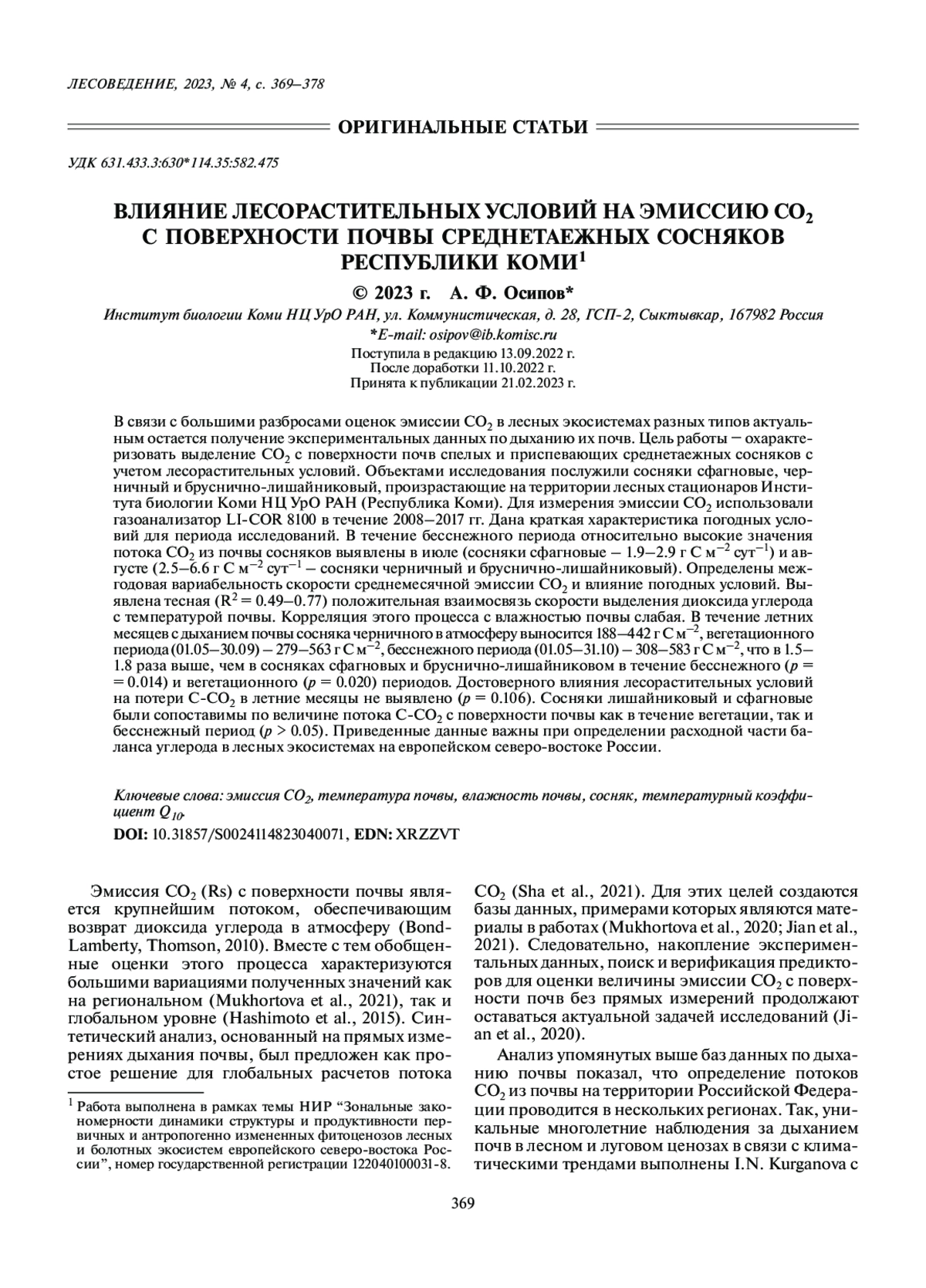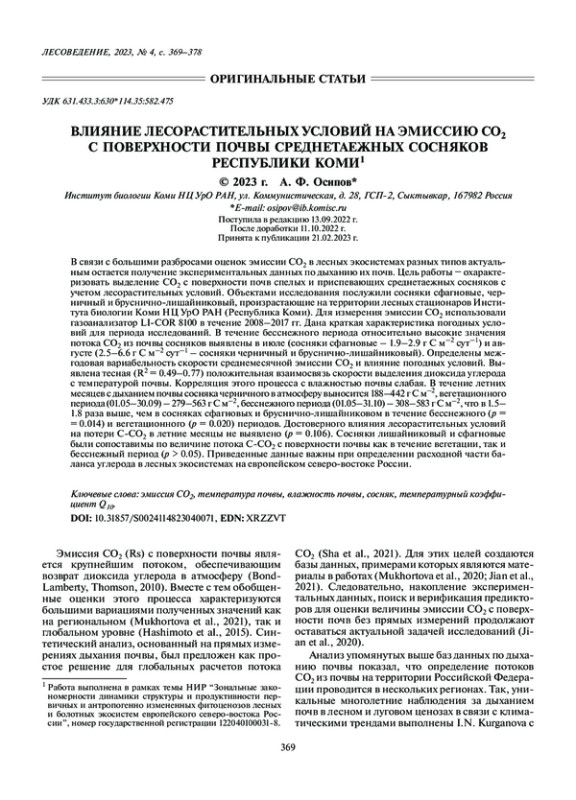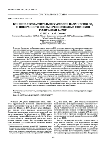 ОСИПОВ А. Ф. ВЛИЯНИЕ ЛЕСОРАСТИТЕЛЬНЫХ УСЛОВИЙ НА ЭМИССИЮ СО2 С ПОВЕРХНОСТИ ПОЧВЫ СРЕДНЕТАЕЖНЫХ СОСНЯКОВ РЕСПУБЛИКИ КОМИ // ЛЕСОВЕДЕНИЕ. 2023. № 4