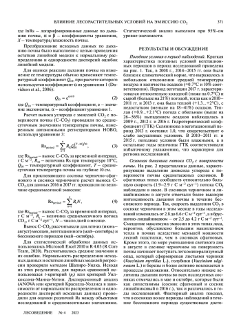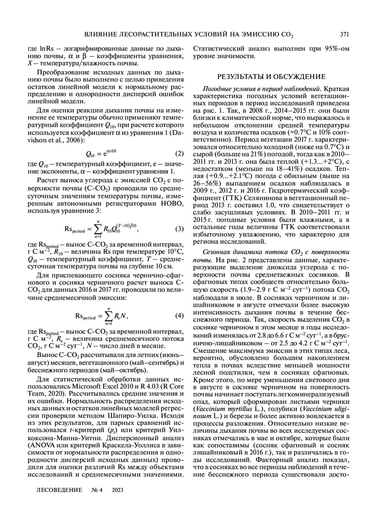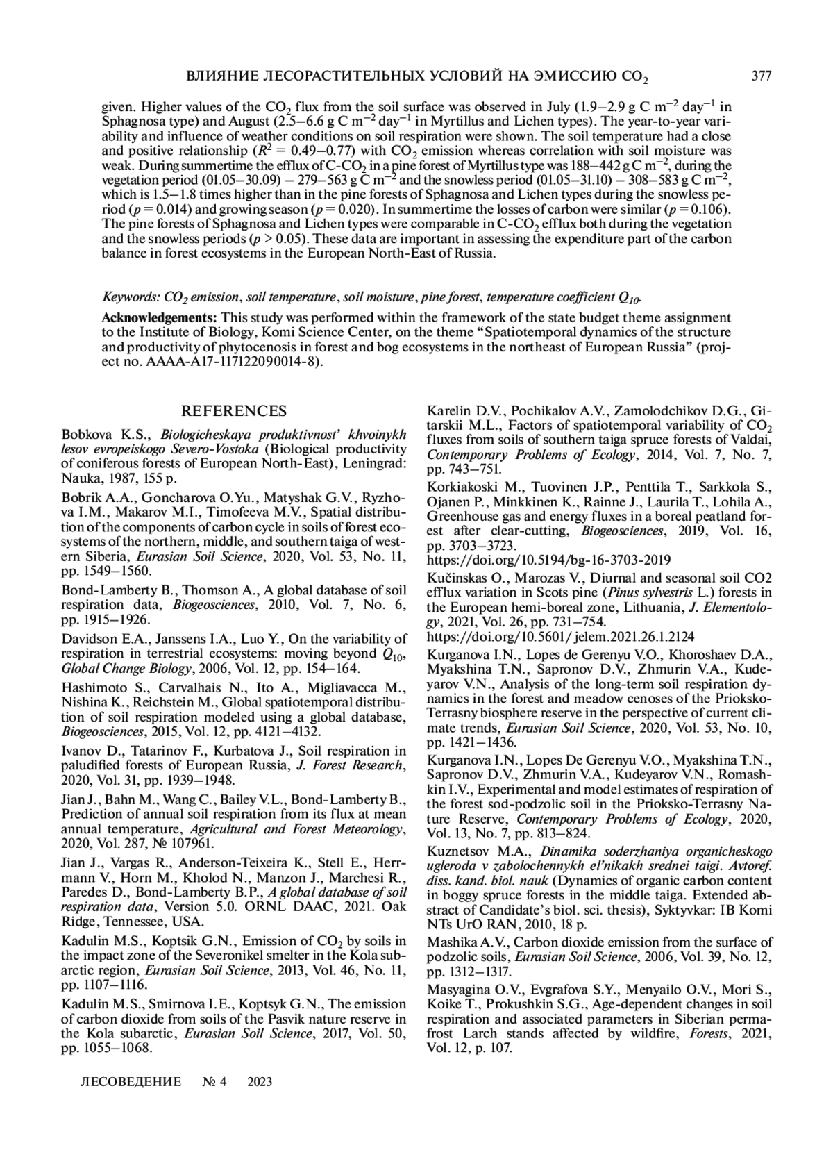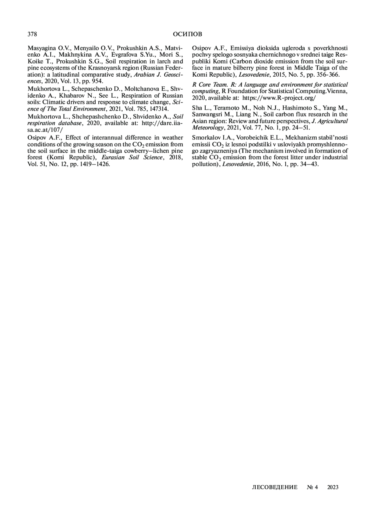 ОСИПОВ А. Ф. ВЛИЯНИЕ ЛЕСОРАСТИТЕЛЬНЫХ УСЛОВИЙ НА ЭМИССИЮ СО2 С ПОВЕРХНОСТИ ПОЧВЫ СРЕДНЕТАЕЖНЫХ СОСНЯКОВ РЕСПУБЛИКИ КОМИ // ЛЕСОВЕДЕНИЕ. 2023. № 4