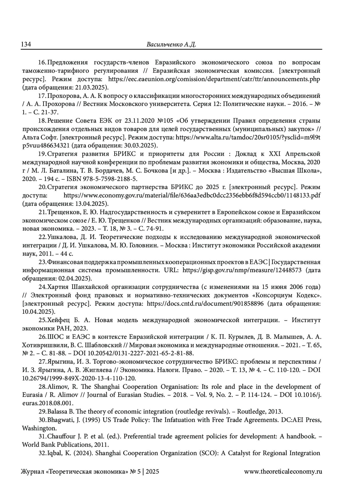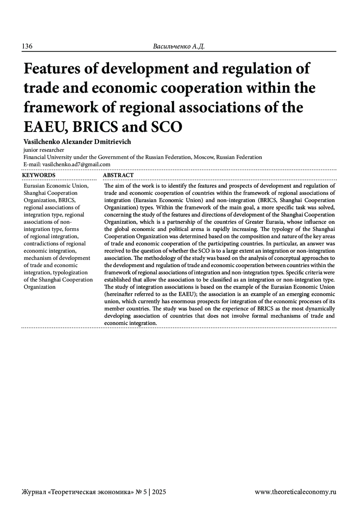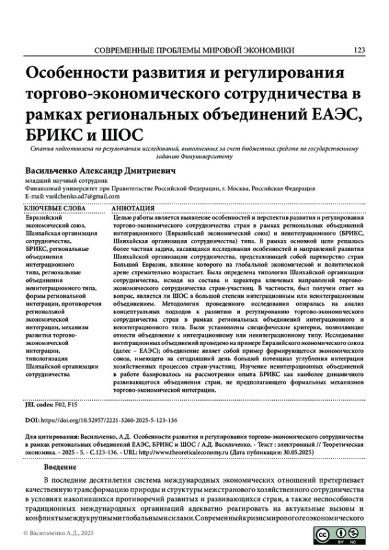 ВАСИЛЬЧЕНКО А. Д. ОСОБЕННОСТИ РАЗВИТИЯ И РЕГУЛИРОВАНИЯ ТОРГОВО-ЭКОНОМИЧЕСКОГО СОТРУДНИЧЕСТВА В РАМКАХ РЕГИОНАЛЬНЫХ ОБЪЕДИНЕНИЙ ЕАЭС, БРИКС И ШОС // ТЕОРЕТИЧЕСКАЯ ЭКОНОМИКА. 2025. № 5 (125)