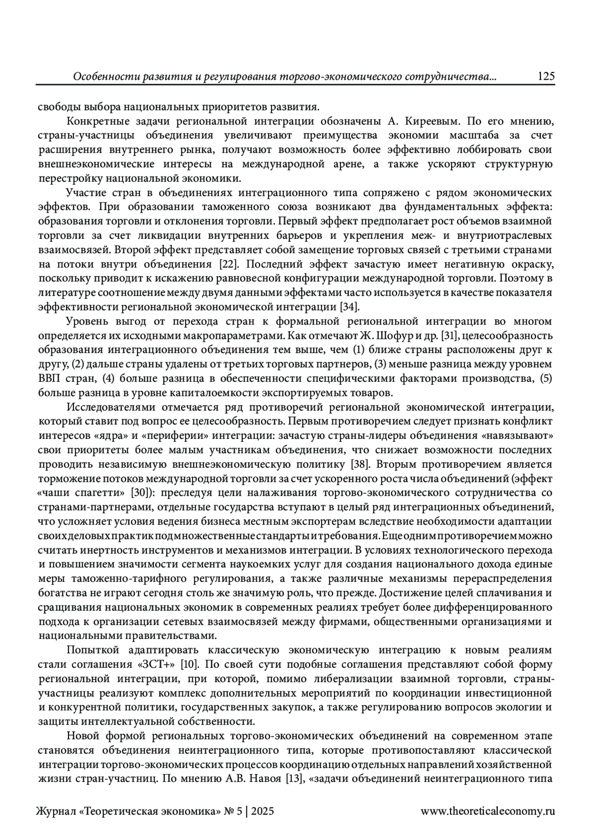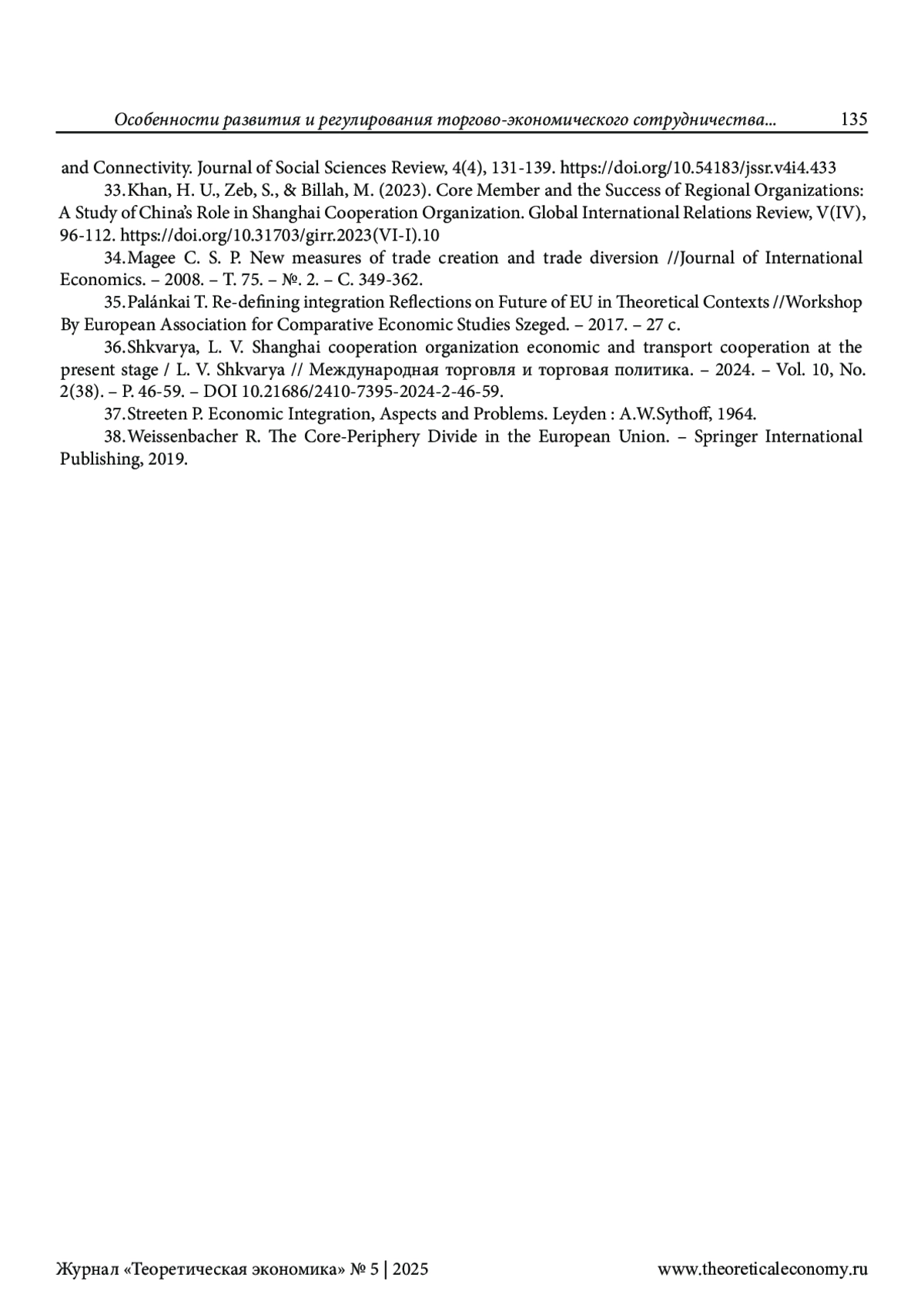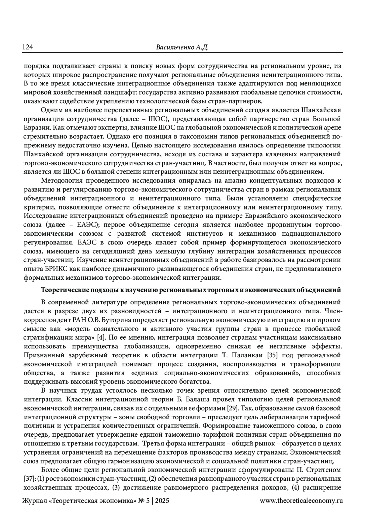 ВАСИЛЬЧЕНКО А. Д. ОСОБЕННОСТИ РАЗВИТИЯ И РЕГУЛИРОВАНИЯ ТОРГОВО-ЭКОНОМИЧЕСКОГО СОТРУДНИЧЕСТВА В РАМКАХ РЕГИОНАЛЬНЫХ ОБЪЕДИНЕНИЙ ЕАЭС, БРИКС И ШОС // ТЕОРЕТИЧЕСКАЯ ЭКОНОМИКА. 2025. № 5 (125)