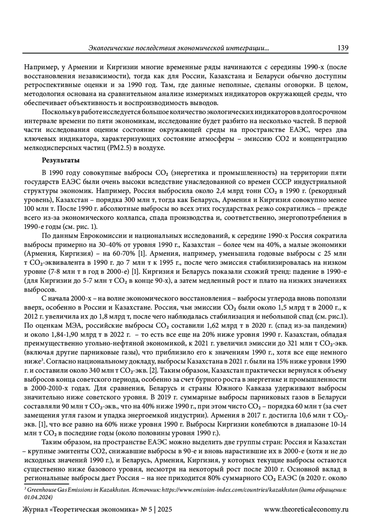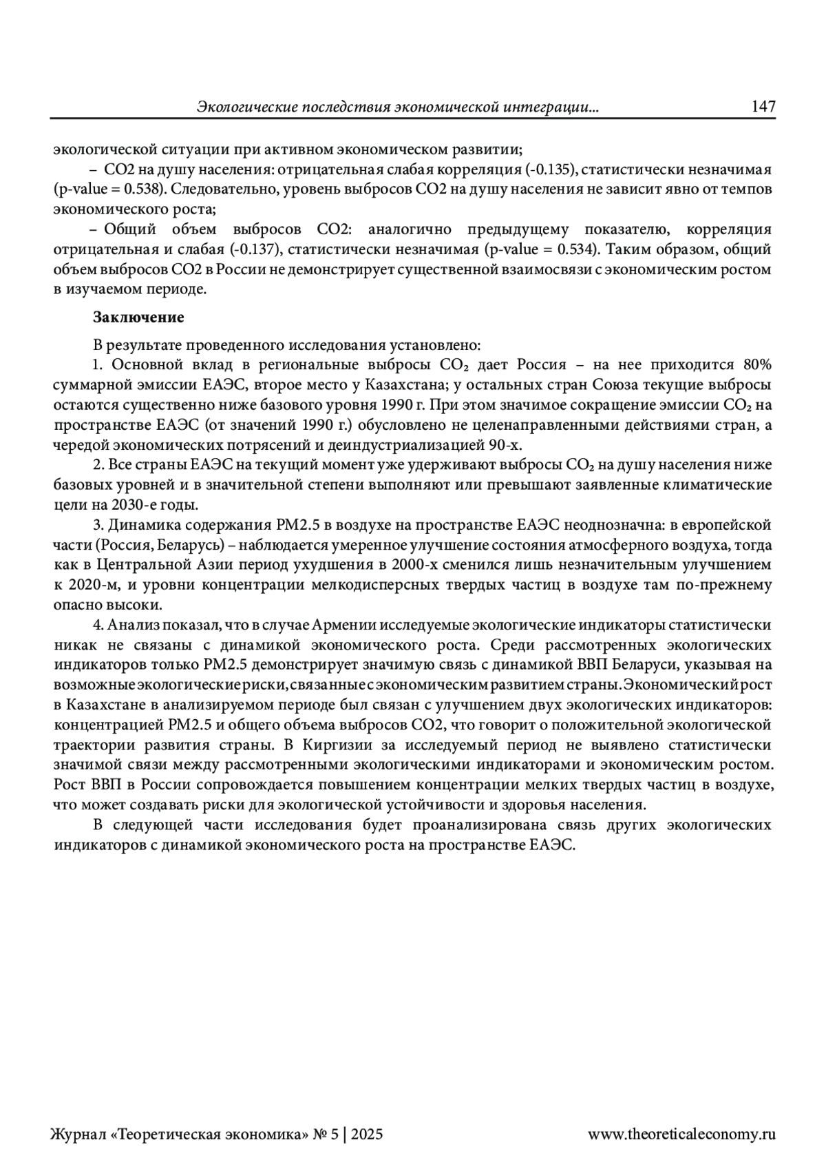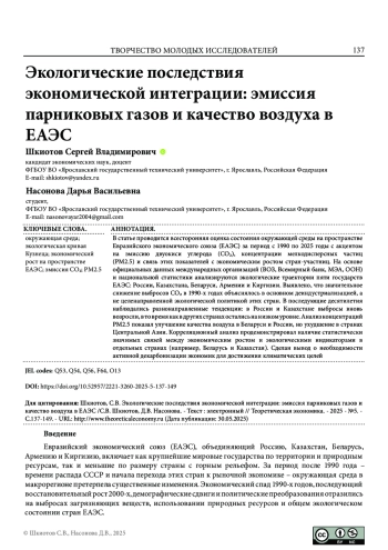 В статье проводится всесторонняя оценка состояния окружающей среды на пространстве Евразийского экономического союза (ЕАЭС) за период с 1990 по 2025 годы с акцентом на эмиссию двуокиси углерода (CO₂), концентрации мелкодисперсных частиц (PM2.5) и связь этих показателей с экономическим ростом стран-участниц. На основе официальных данных международных организаций (ВОЗ, Всемирный банк, МЭА, ООН) и национальной статистики анализируются экологические траектории пяти государств ЕАЭС: России, Казахстана, Беларуси, Армении и Киргизии. Выявлено, что значительное снижение выбросов CO₂ в 1990-х годах объяснялось в основном деиндустриализацией, а не целенаправленной экологической политикой этих стран. В последующие десятилетия наблюдались разнонаправленные тенденции: в России и Казахстане выбросы вновь возросли, в то время как в других странах остались на низком уровне. Анализ концентраций PM2.5 показал улучшение качества воздуха в Беларуси и России, но ухудшение в странах Центральной Азии. Корреляционный анализ продемонстрировал наличие статистически значимых связей между экономическим ростом и экологическими индикаторами в отдельных странах (например, Беларусь и Казахстан). Сделан вывод о необходимости активной декарбонизации экономик для достижения климатических целей