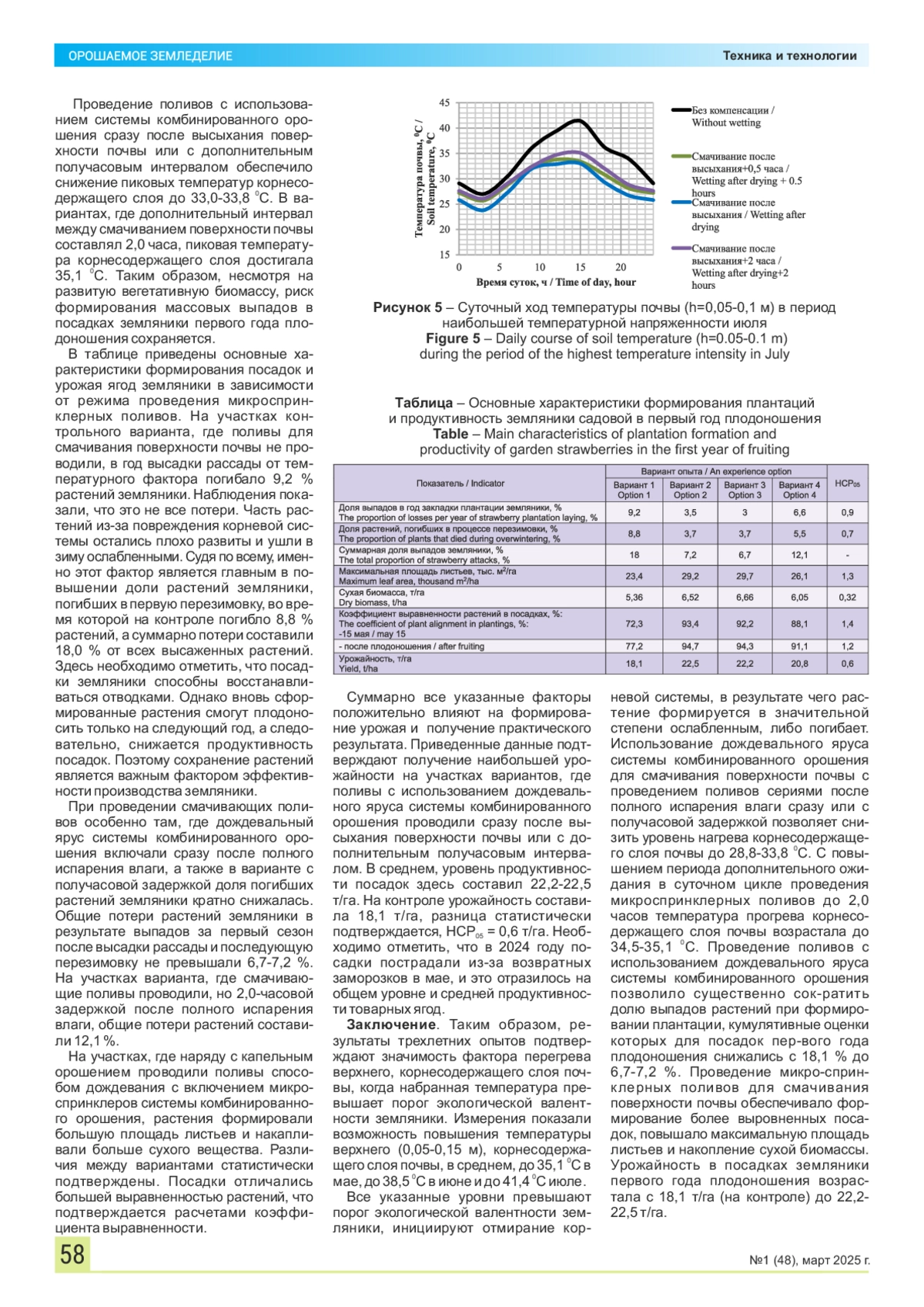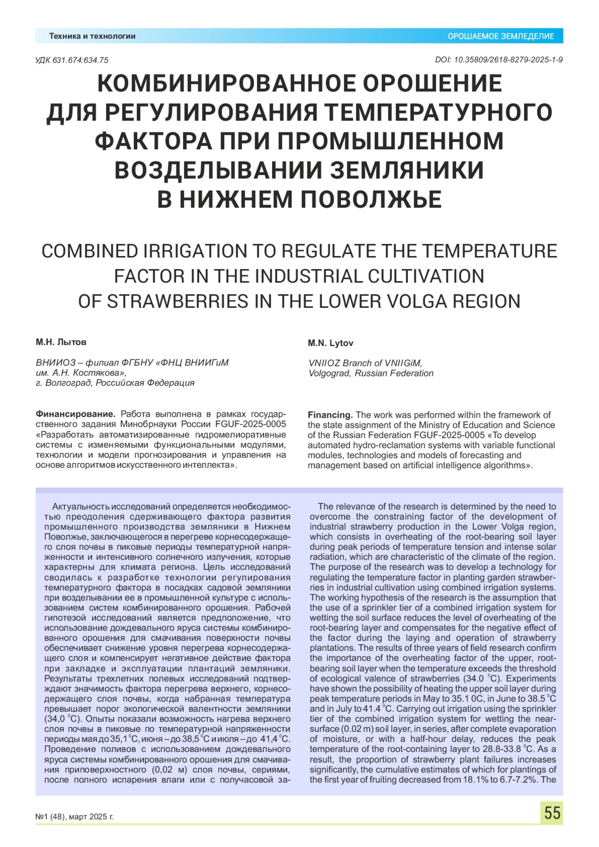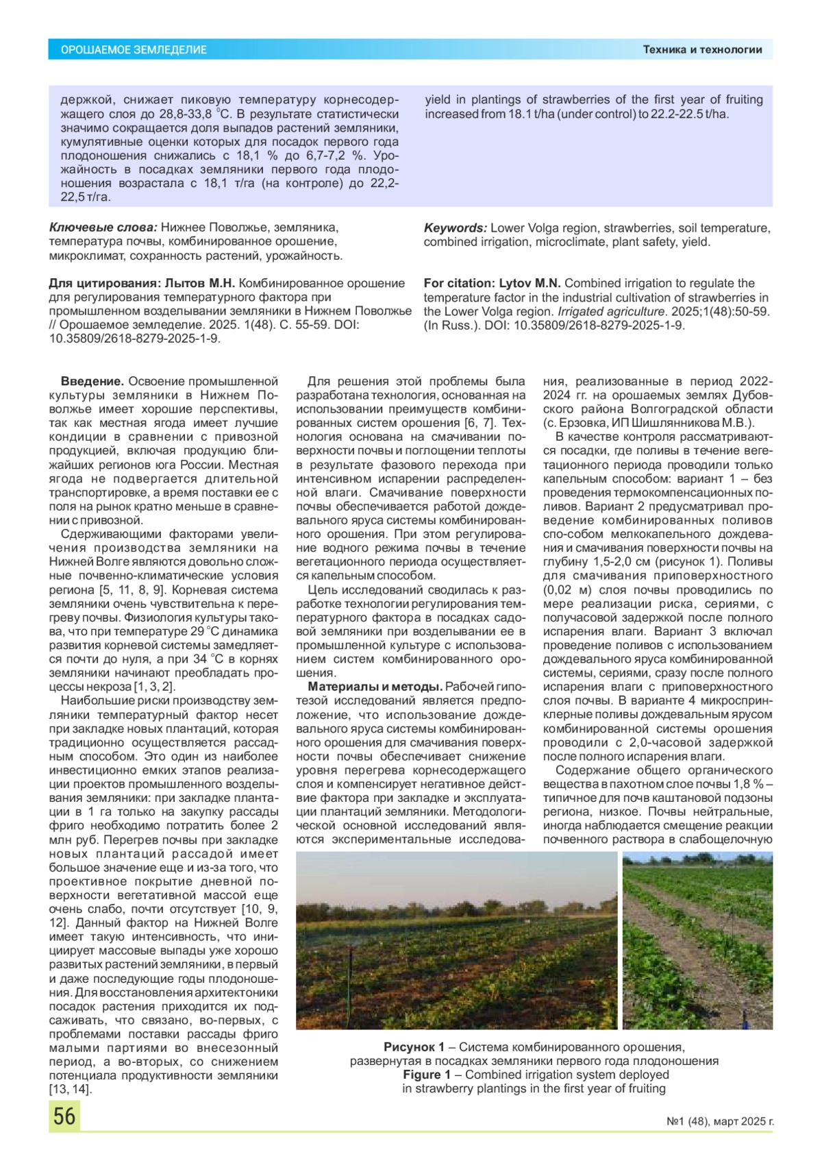 3. Гуренко В.М., Лытов М.Н. Обоснование адаптивной конструкции гряд при капельном орошении земляники в условиях континентального климата Нижнего Поволжья // Орошаемое земледелие. 2024. № 2 (45). С. 46-51. DOI: 10.35809/2618-8279-2024-2-8
