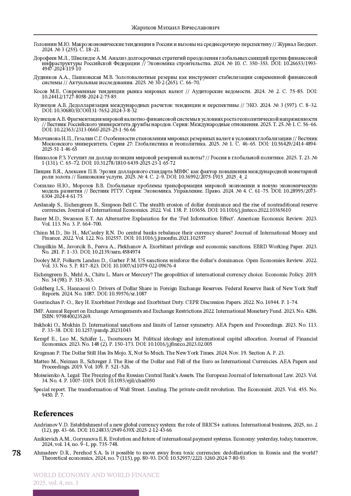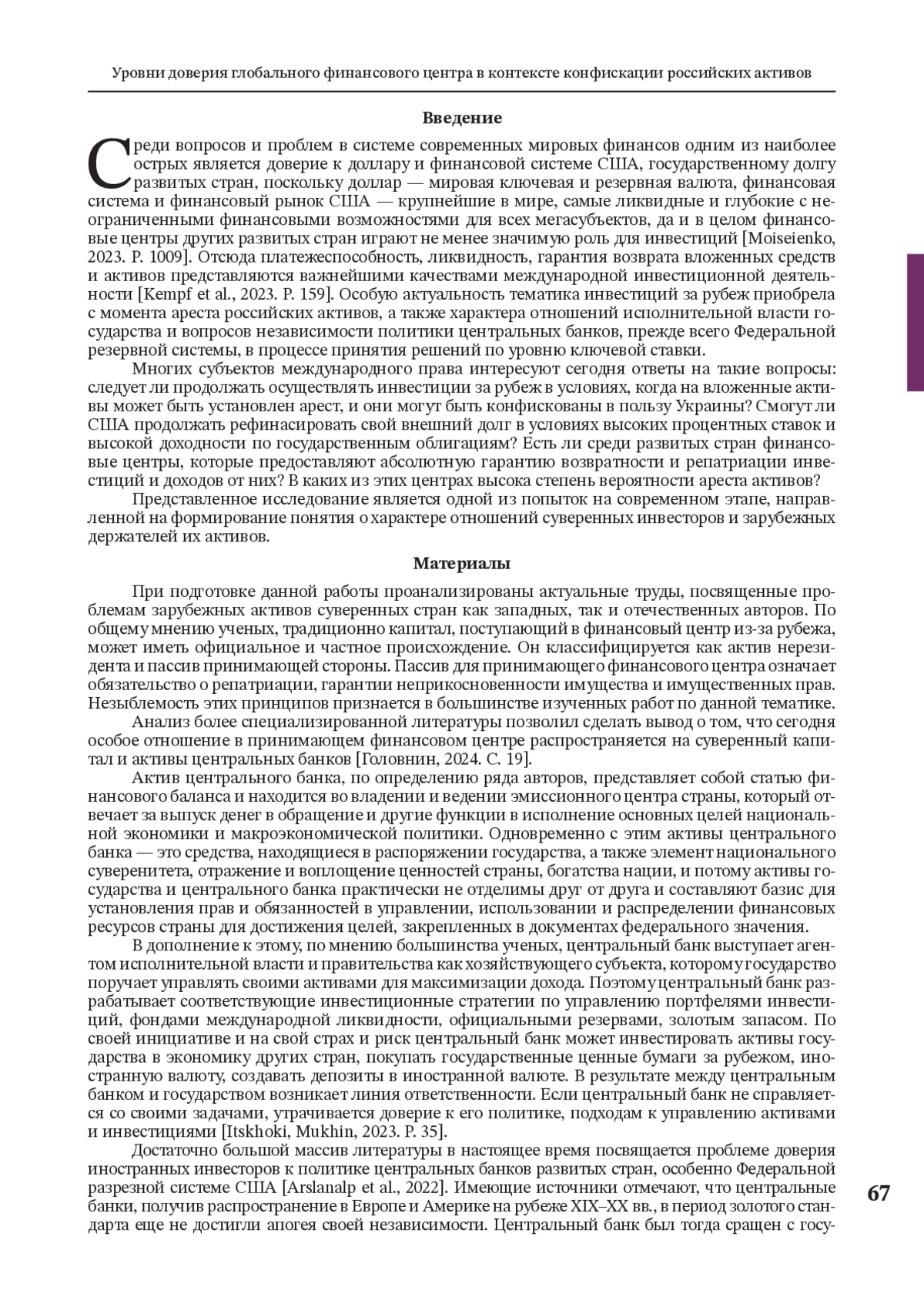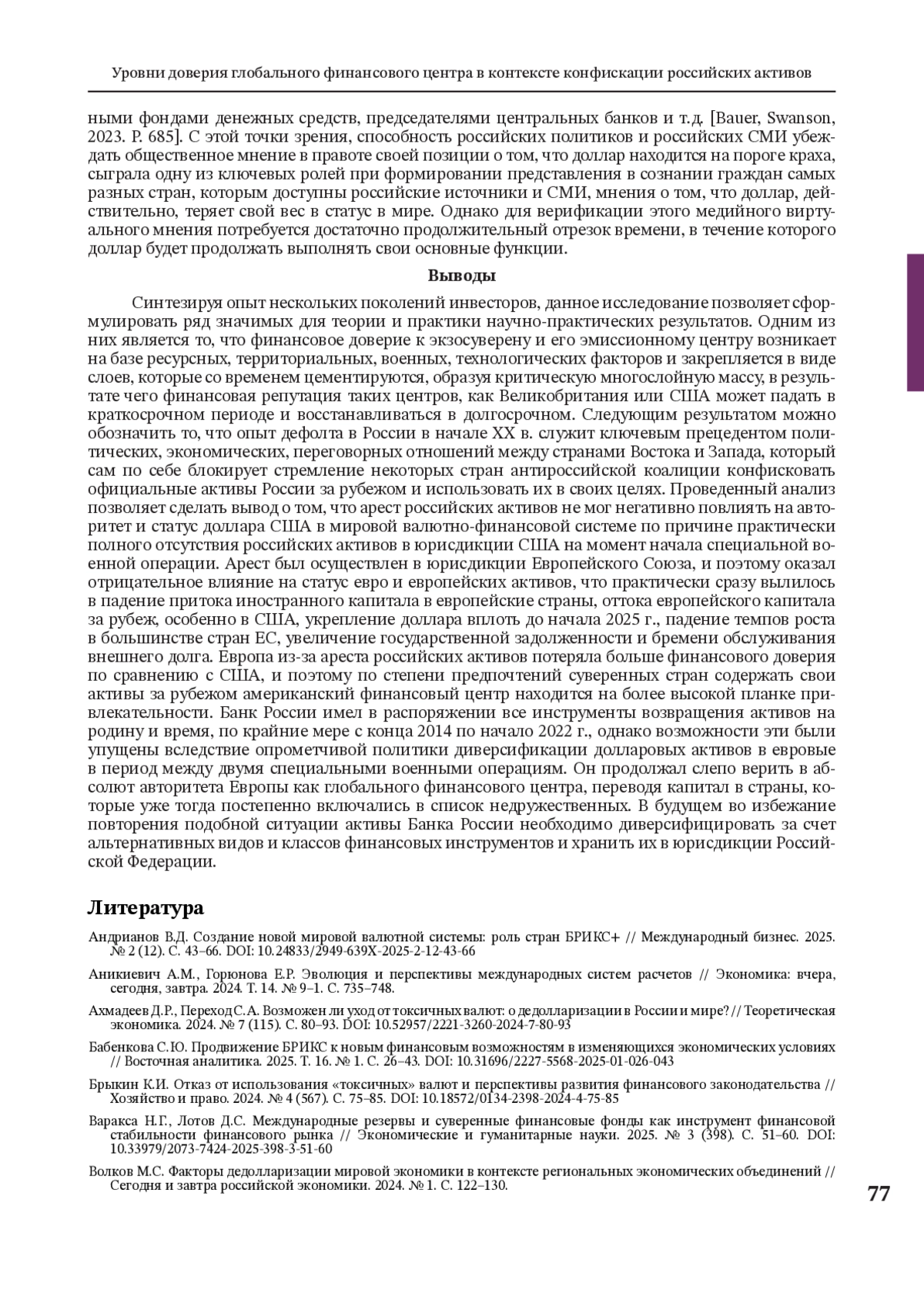 ЖАРИКОВ М. В. УРОВНИ ДОВЕРИЯ ГЛОБАЛЬНОГО ФИНАНСОВОГО ЦЕНТРА В КОНТЕКСТЕ КОНФИСКАЦИИ РОССИЙСКИХ АКТИВОВ // МИРОВАЯ ЭКОНОМИКА И МИРОВЫЕ ФИНАНСЫ. 2025. № 3, ТОМ 4
