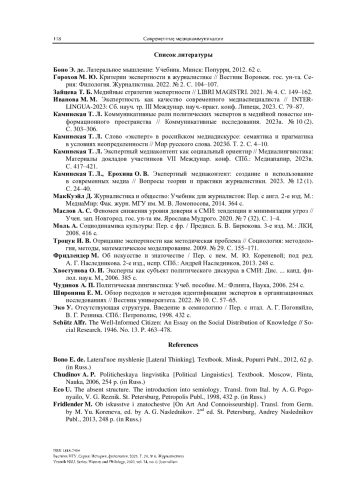 5. Каминская Т. Л. Коммуникативные роли политических экспертов в медийной повестке ин- формационного пространства // Коммуникативные исследования. 2023а. № 10 (2). С. 303-306.