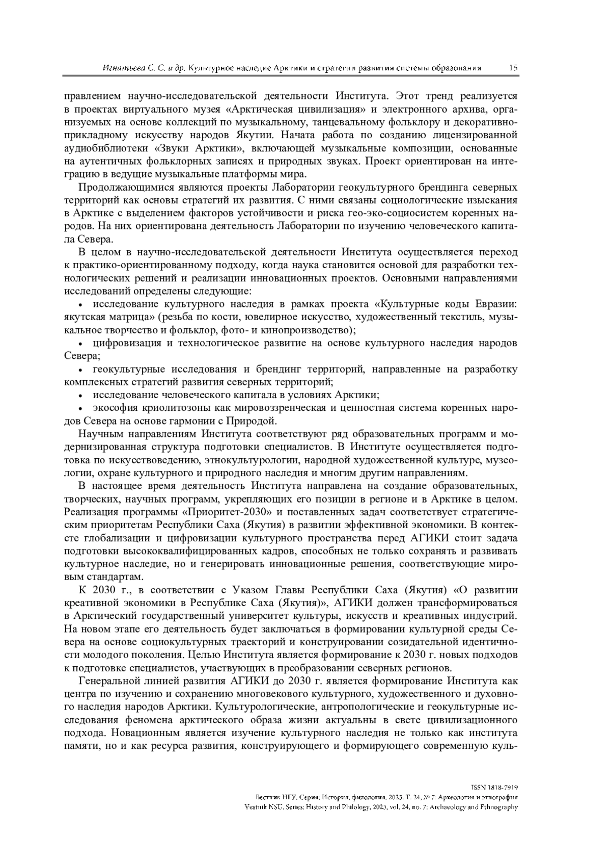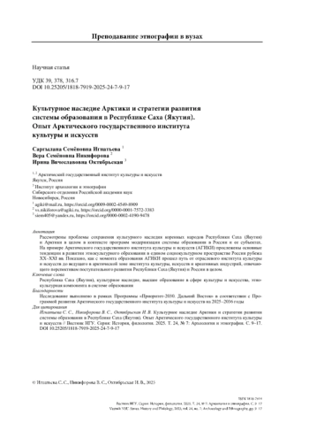 Рассмотрены проблемы сохранения культурного наследия коренных народов Республики Саха (Якутия) и Арктики в целом в контексте программ модернизации системы образования в России и ее субъектах. На примере Арктического государственного института культуры и искусств (АГИКИ) прослежены основные тенденции в развитии этнокультурного образования в едином социокультурном пространстве России рубежа ХХ–XXI вв. Показано, как с момента образования АГИКИ прошел путь от отраслевого института культуры и искусств до ведущего в арктической зоне института культуры, искусств и креативных индустрий, отвечающего перспективам поступательного развития Республики Саха (Якутия) и России в целом.