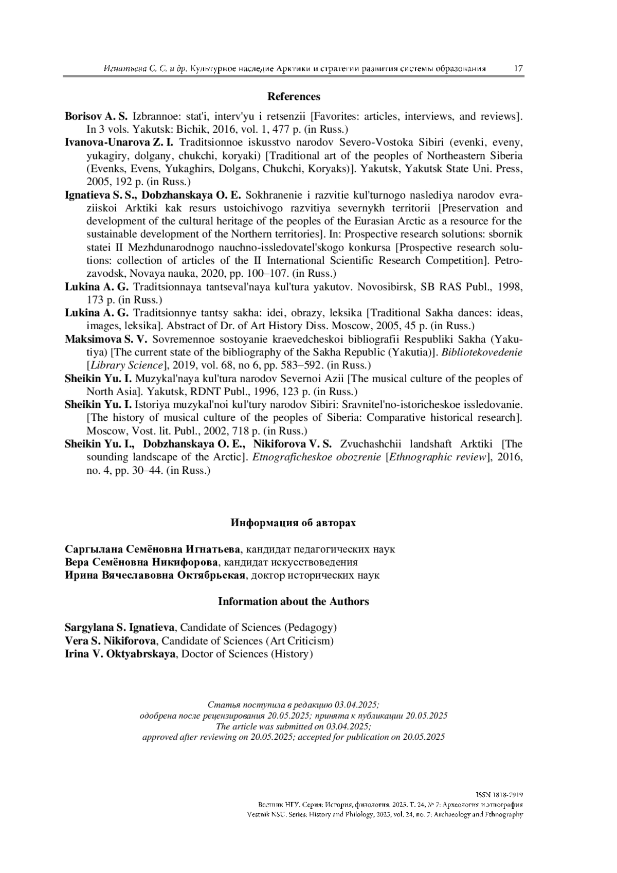 3. Игнатьева С. С., Добжанская О. Э. Сохранение и развитие культурного наследия народов евразийской Арктики как ресурс устойчивого развития северных территорий // Prospective research solutions: Сб. ст. II Междунар. науч.-исслед. конкурса. Петрозаводск: Новая наука, 2020. С. 100-107.