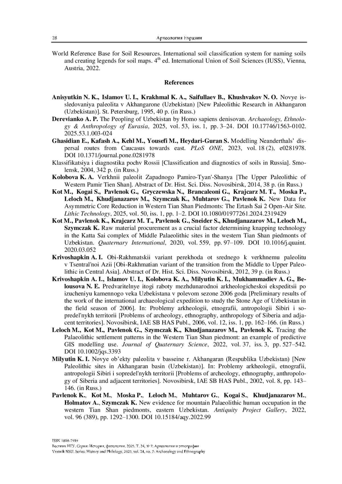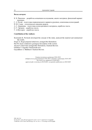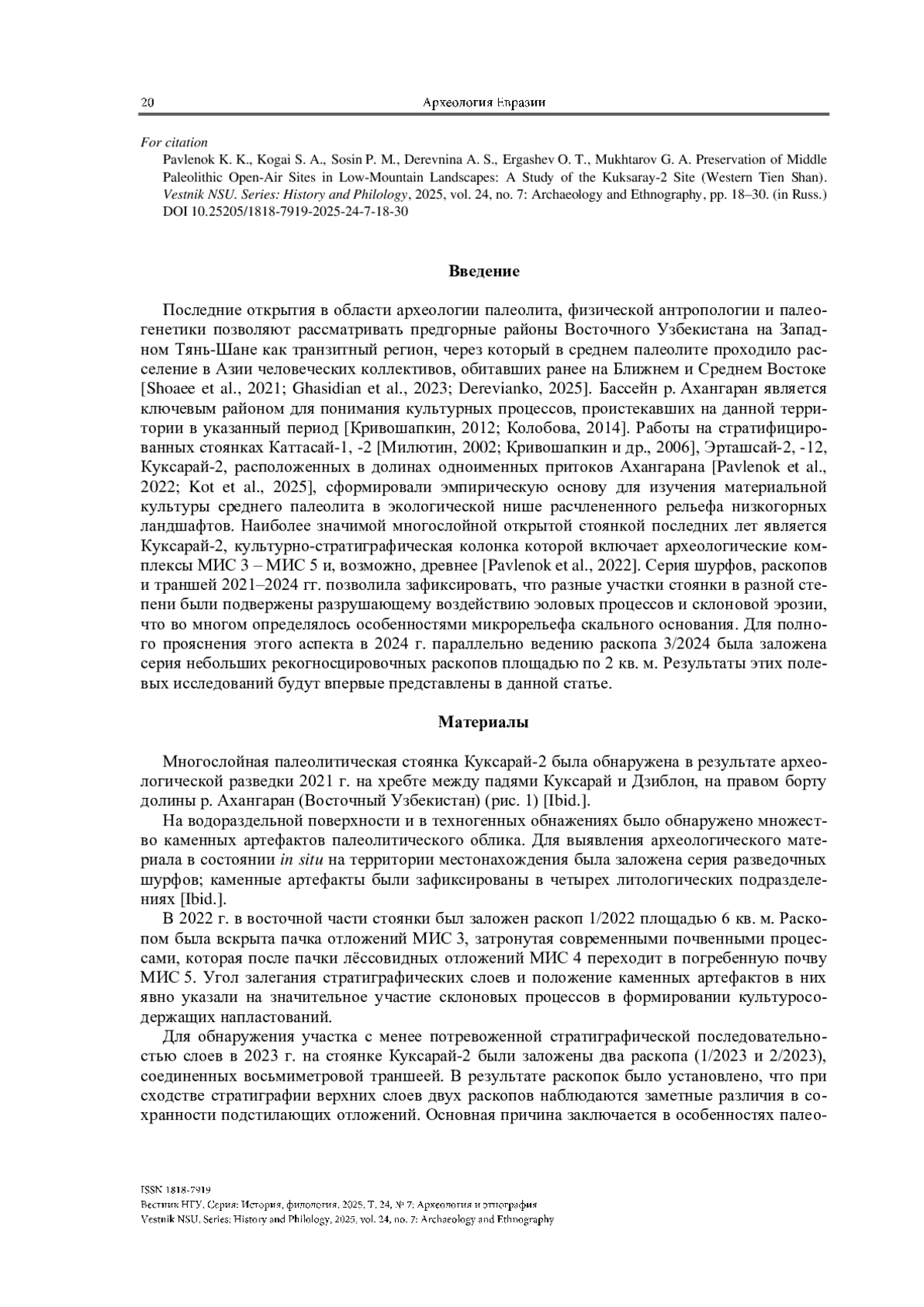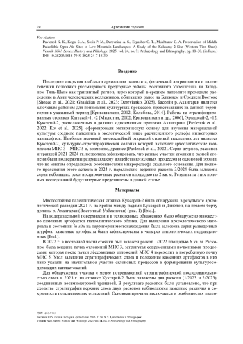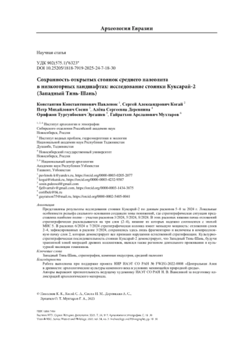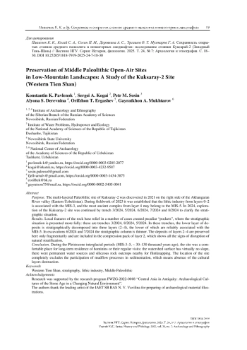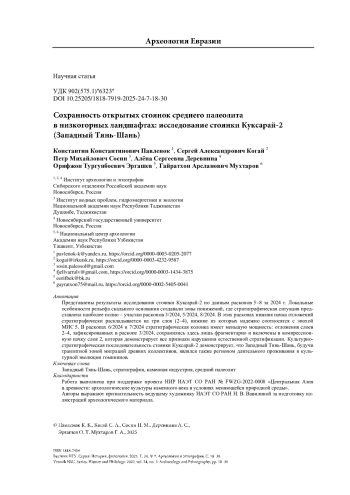 Представлены результаты исследования стоянки Куксарай-2 по данным раскопов 5–8 за 2024 г. Локальные особенности рельефа скального основания создавали зоны понижений, где стратиграфическая ситуация представлена наиболее полно – участки раскопов 3/2024, 5/2024, 8/2024. В этих раскопах нижняя пачка отложений стратиграфически раскладывается на три слоя (2–4), нижние из которых надежно соотносятся с эпохой МИС 5. В раскопах 6/2024 и 7/2024 стратиграфическая колонка имеет меньшую мощность: отложения слоев 2–4, зафиксированных в раскопе 3/2024, сохранились здесь лишь фрагментарно и включены в компрессионную пачку слоя 2, которая демонстрирует все признаки нарушения естественной стратификации. Культурно-стратиграфическая последовательность стоянки Куксарай-2 демонстрирует, что Западный Тянь-Шань, будучи транзитной зоной миграций древних коллективов, являлся также регионом длительного проживания и культурной эволюции гомининов.