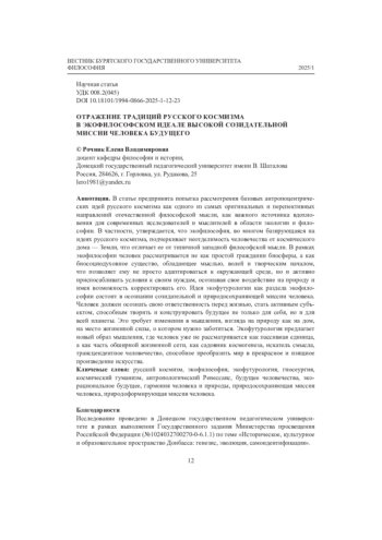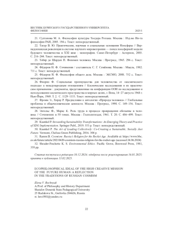 Экофилософия как сравнительно новое философское направление во многом базируется на идейном наследии русского космизма или, по определению BBC, «религии России для эпохи ракет» («Russiaʼs religion for the rocket age») [31]. Это течение является одним из самых уникальных, глубоких и перспективных в истории философской мысли, эффективно объединяет эле - менты восточной и западной философии, а также идеи Русской православной церкви, направленные на гармоничное развитие человека в его взаимодействии с природой. К сожалению, с русским космизмом широкой аудитории, интересующейся философскими вопросами, стало возможно познакомиться лишь после проведения Первых Федоровских чтений, которые прошли в 1988 г. в Боровске, расположенном в Калужской области.
