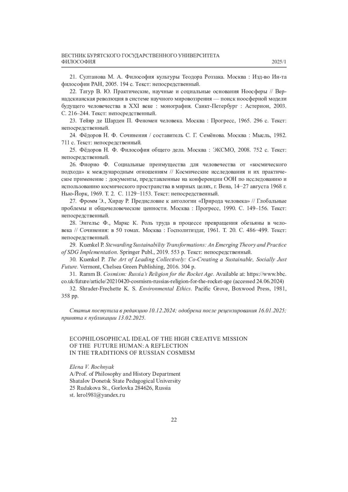 14. Рочняк Е. В. Антропоцентричность экофутурологии как раздела экофилософии // Вестник Бурятского государственного университета. Философия. 2024. № 2. С. 47-52. Текст: непосредственный.