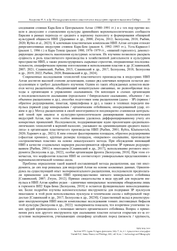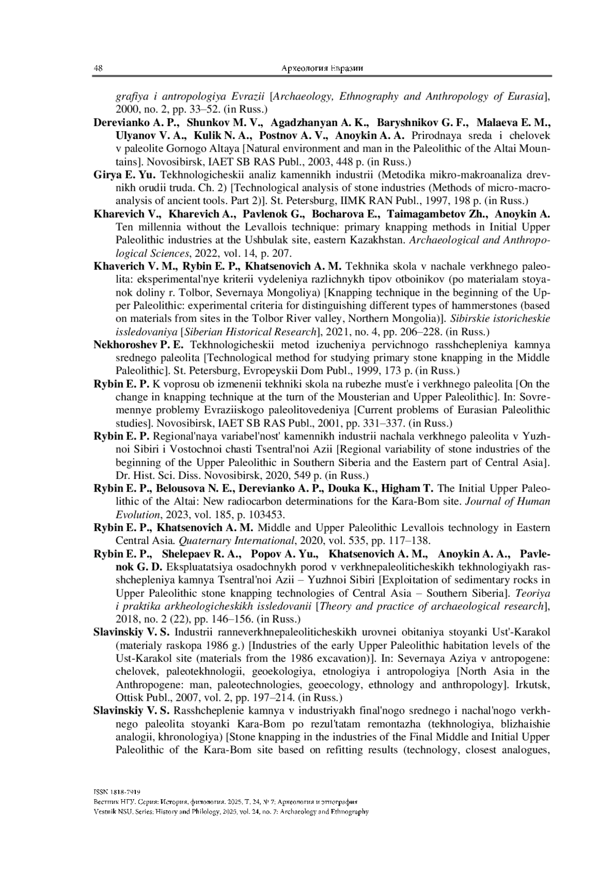 21. Rybin E. P., Belousova N. E., Derevianko A. P., Douka K., Higham T. The Initial Upper Paleo lithic of the Altai: New radiocarbon determinations for the Kara-Bom site // Journal of Human Evolution. 2023. Vol. 185. P. 103453.